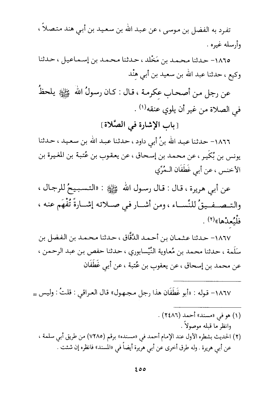 1867 - حَدَّثَنَا عُثْمَانُ بْنُ أَحْمَدَ الدَّقَّاقُ , حَدَّثَنَا مُحَمَّدُ بْنُ الْفَضْلِ بْنِ سَلَمَةَ , ثنا مُحَمَّدُ بْنُ مُعَاوِيَةَ النَّيْسَابُورِيُّ , نا حَفْصُ بْنُ عَبْدِ الرَّحْمَنِ , عَنْ مُحَمَّدِ بْنِ إِسْحَاقَ , عَنْ يَعْقُوبَ بْنِ عُتْبَةَ , عَنْ أَبِي غَطَفَانَ , -[456]- عَنْ أَبِي هُرَيْرَةَ , قَالَ: قَالَ رَسُولُ اللَّهِ صَلَّى اللهُ عَلَيْهِ وَسَلَّمَ: § «مَنْ أَشَارَ فِي صَلَاتِهِ إِشَارَةً تُفْهَمُ عَنْهُ فَلْيُعِدْ صَلَاتَهُ». قَالَ لَنَا ابْنُ أَبِي دَاوُدَ: أَبُوغَطَفَانَ هَذَا رَجُلٌ مَجْهُولٌ , وَآخِرُ الْحَدِيثِ زِيَادَةٌ فِي الْحَدِيثِ وَلَعَلَّهُ مِنْ قَوْلِ ابْنِ إِسْحَاقَ , وَالصَّحِيحُ عَنِ النَّبِيِّ صَلَّى اللهُ عَلَيْهِ وَسَلَّمَ أَنَّهُ كَانَ يُشِيرُ فِي الصَّلَاةِ رَوَاهُ أَنَسٌ , وَجَابِرٌ , وَغَيْرُهُمَا عَنِ النَّبِيِّ صَلَّى اللهُ عَلَيْهِ وَسَلَّمَ. قَالَ الشَّيْخُ أَبُو الْحَسَنِ: وَقَدْ رَوَاهُ ابْنُ عُمَرَ , وَعَائِشَةُ أَيْضًا