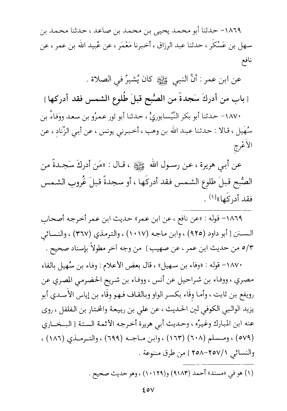 1870 - حَدَّثَنَا أَبُو بَكْرٍ النَّيْسَابُورِيُّ , حَدَّثَنَا أَبُو ثَوْرٍعَمْرُو بْنُ سَعْدٍ , وَوَفَاءُ بْنُ سُهَيْلٍ قَالَا: ثنا عَبْدُ اللَّهِ بْنُ وَهْبٍ , أَخْبَرَنِي يُونُسُ , عَنْ أَبِي الزِّنَادِ , عَنِ الْأَعْرَجِ , عَنْ أَبِي هُرَيْرَةَ , عَنْ رَسُولِ اللَّهِ صَلَّى اللهُ عَلَيْهِ وَسَلَّمَ قَالَ: § «مَنْ أَدْرَكَ سَجْدَةً مِنَ الصُّبْحِ قَبْلَ طُلُوعِ الشَّمْسِ فَقَدْ أَدْرَكَهَا , أَوْ سَجْدَةً قَبْلَ غُرُوبِ الشَّمْسِ فَقَدْ أَدْرَكَهَا»