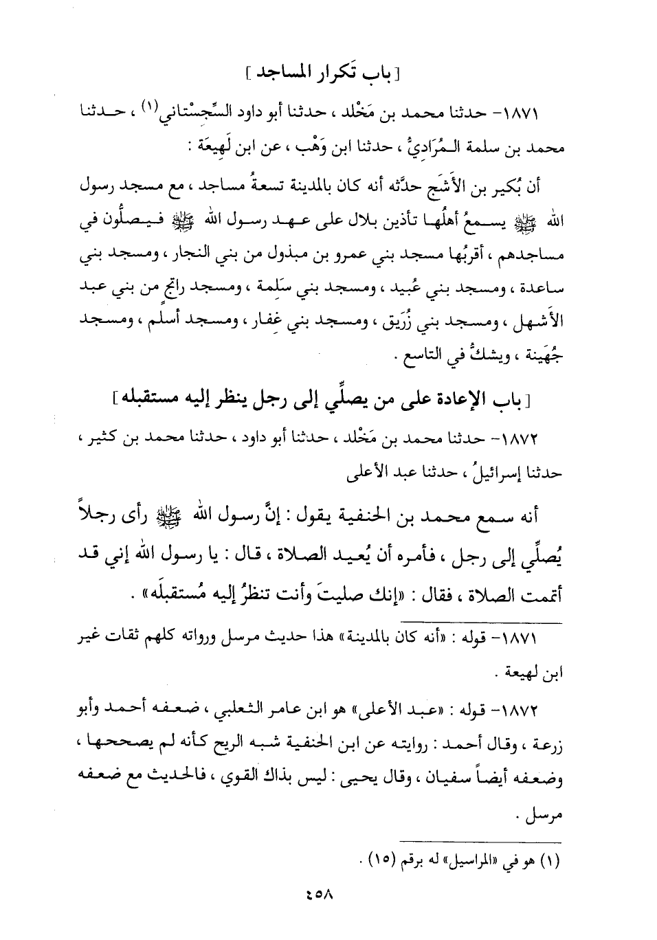 1871 - حَدَّثَنَا مُحَمَّدُ بْنُ مَخْلَدٍ , ثنا أَبُو دَاوُدَ السِّجِسْتَانِيُّ , ثنا مُحَمَّدُ بْنُ سَلَمَةَ الْمُرَادِيُّ , حَدَّثَنَا ابْنُ وَهْبٍ , عَنِ ابْنِ لَهِيعَةَ , أَنَّ بُكَيْرَ بْنَ الْأَشَجِّ حَدَّثَهُ: «أَنَّهُ كَانَ بِالْمَدِينَةِ §تِسْعَةُ مَسَاجِدَ مَعَ مَسْجِدِ رَسُولِ اللَّهِ صَلَّى اللهُ عَلَيْهِ وَسَلَّمَ يَسْمَعُ أَهْلُهَا تَأْذِينَ بِلَالٍ عَلَى عَهْدِ رَسُولِ اللَّهِ صَلَّى اللهُ عَلَيْهِ وَسَلَّمَ فَيُصَلُّونَ فِي مَسَاجِدِهِمْ أَقْرَبُهَا مَسْجِدُ بَنِي عَمْرِو بْنِ مَبْذُولٍ مِنْ بَنِي النَّجَّارِ , وَمَسْجِدُ بَنِي سَاعِدَةَ , وَمَسْجِدُ بَنِي عُبَيْدٍ , وَمَسْجِدُ بَنِي سَلِمَةَ , وَمَسْجِدُ بَنِي رَاتِجٍ مِنْ بَنِي عَبْدِ الْأَشْهَلِ , وَمَسْجِدُ بَنِي زُرَيْقٍ , وَمَسْجِدُ بَنِي غِفَارَ , وَمَسْجِدُ أَسْلَمَ , وَمَسْجِدُ جُهَيْنَةَ , وَيَشُكُّ فِي التَّاسِعِ»