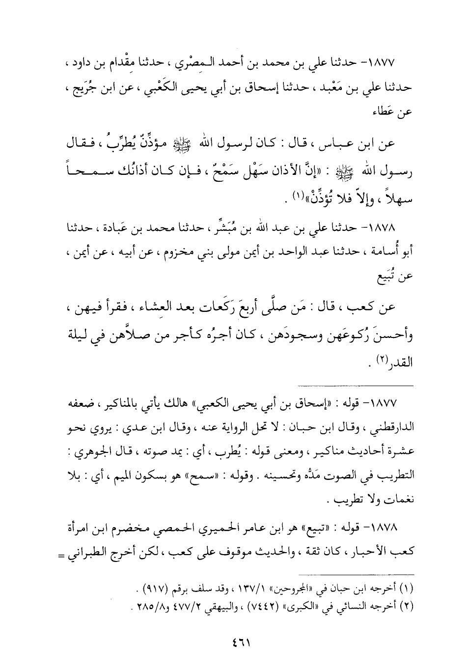 1877 - حَدَّثَنَا عَلِيُّ بْنُ مُحَمَّدٍ الْمِصْرِيُّ , ثنا مِقْدَامُ بْنُ دَاوُدَ , ثنا عَلِيُّ بْنُ مَعْبَدٍ , ثنا إِسْحَاقُ بْنُ أَبِي يَحْيَى الْكَعْبِيُّ , عَنِ ابْنِ جُرَيْجٍ , عَنْ عَطَاءٍ , عَنِ ابْنِ عَبَّاسٍ , قَالَ: كَانَ لِرَسُولِ اللَّهِ صَلَّى اللهُ عَلَيْهِ وَسَلَّمَ مُؤَذِّنٌ يُطْرِبُ , فَقَالَ رَسُولُ اللَّهِ صَلَّى اللهُ عَلَيْهِ وَسَلَّمَ: «إِنَّ §الْأَذَانَ سَهْلٌ سَمْحٌ فَإِنْ كَانَ أَذَانُكَ سَمْحًا سَهْلًا وَإِلَّا فَلَا تُؤَذِّنْ»