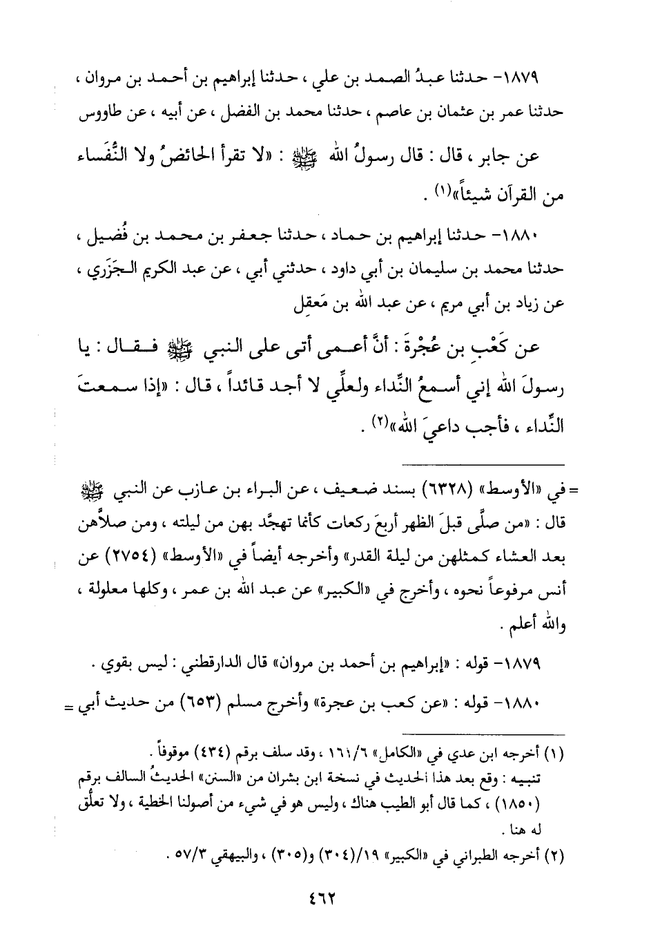 1879 - حَدَّثَنَا عَبْدُ الصَّمَدِ بْنُ عَلِيٍّ , ثنا إِبْرَاهِيمُ بْنُ أَحْمَدَ بْنِ مَرْوَانَ , ثنا عُمَرُ بْنُ عُثْمَانَ بْنِ عَاصِمٍ , ثنا مُحَمَّدُ بْنُ الْفَضْلِ , عَنْ أَبِيهِ , عَنْ طَاوُسٍ , عَنْ جَابِرٍ , قَالَ: قَالَ رَسُولُ اللَّهِ صَلَّى اللهُ عَلَيْهِ وَسَلَّمَ: § «لَا تَقْرَأِ الْحَائِضُ وَلَا النُّفَسَاءُ مِنَ الْقُرْآنِ شَيْئًا»