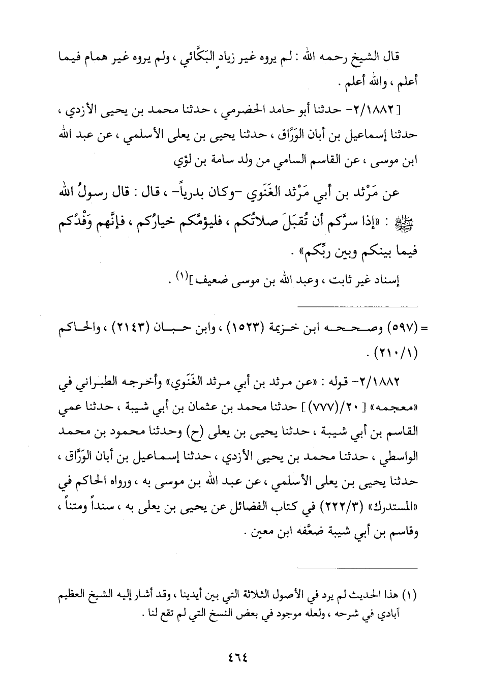1882 - حَدَّثَنَا أَبُو حَامِدٍ الْحَضْرَمِيُّ , نا مُحَمَّدُ بْنُ يَحْيَى الْأَزْدِيُّ , نا إِسْمَاعِيلُ بْنُ أَبَانَ الْوَرَّاقُ , نا يَحْيَى بْنُ يَعْلَى الْأَسْلَمِيُّ , عَنْ عَبْدِ اللَّهِ بْنِ مُوسَى , عَنِ الْقَاسِمِ السَّامِيِّ مِنْ وَلَدِ سَامَةَ بْنِ لُؤَيٍّ , عَنْ مَرْثَدِ بْنِ أَبِي مَرْثَدٍ الْغَنَوِيِّ وَكَانَ بَدْرِيًّا , قَالَ: قَالَ رَسُولُ اللَّهِ صَلَّى اللهُ عَلَيْهِ وَسَلَّمَ: § «إِذَا سَرَّكُمْ أَنْ تُقْبَلَ صَلَاتُكُمْ فَلْيَؤُمَّكُمْ خِيَارُكُمْ , فَإِنَّهُمْ وَفْدُكُمْ فِيمَا بَيْنَكُمْ وَبَيْنَ رَبِّكُمْ». إِسْنَادٌ غَيْرُ ثَابِتٍ , وَعَبْدُ اللَّهِ بْنُ مُوسَى ضَعِيفٌ