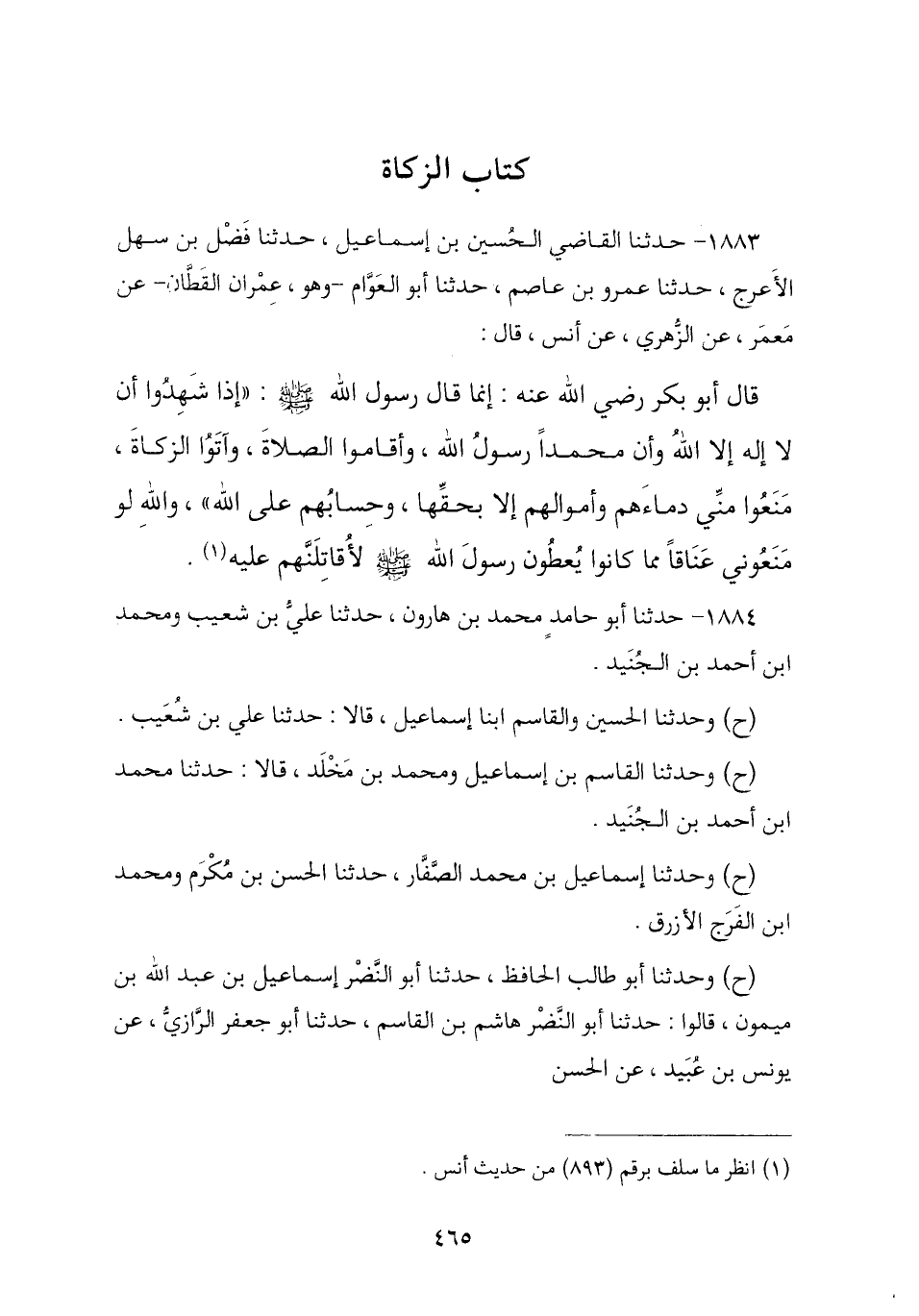 1883 - حَدَّثَنَا الْحُسَيْنُ بْنُ إِسْمَاعِيلَ , ثنا فَضْلُ بْنُ سَهْلٍ الْأَعْرَجُ , ثنا عَمْرُو بْنُ عَاصِمٍ , حَدَّثَنَا أَبُو الْعَوَّامِ وَهُوَ عِمْرَانُ الْقَطَّانُ عَنْ مَعْمَرٍ , عَنِ الزُّهْرِيِّ , عَنْ أَنَسٍ , قَالَ: قَالَ أَبُو بَكْرٍ: إِنَّمَا قَالَ رَسُولُ اللَّهِ صَلَّى اللهُ عَلَيْهِ وَسَلَّمَ: «إِذَا شَهِدُوا أَنْ لَا إِلَهَ إِلَّا اللَّهُ وَأَنَّ مُحَمَّدًا رَسُولُ اللَّهِ وَأَقَامُوا الصَّلَاةَ وَآتَوُا الزَّكَاةَ §مَنَعُوا مِنِّي دِمَاءَهُمْ وَأَمْوَالَهُمْ إِلَّا بِحَقِّهَا وَحِسَابُهُمْ عَلَى اللَّهِ». , وَاللَّهِ لَوْ مَنَعُونِي عَنَاقًا مِمَّا كَانُوا يُعْطُونَ رَسُولَ اللَّهِ صَلَّى اللهُ عَلَيْهِ وَسَلَّمَ لَأُقَاتِلَنَّهُمْ عَلَيْهِ