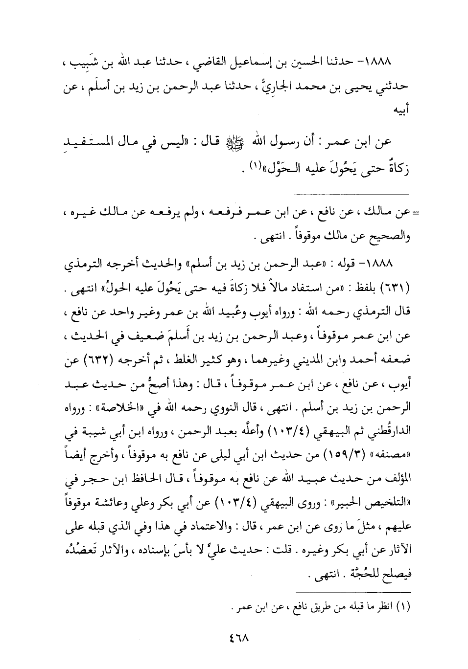 1888 - حَدَّثَنَا الْحُسَيْنُ بْنُ إِسْمَاعِيلَ , ثنا عَبْدُ اللَّهِ بْنُ شَبِيبٍ , حَدَّثَنِي يَحْيَى بْنُ مُحَمَّدٍ الْجَارِيُّ , ثنا عَبْدُ الرَّحْمَنِ بْنُ زَيْدِ بْنِ أَسْلَمَ , عَنْ أَبِيهِ , عَنِ ابْنِ عُمَرَ , أَنَّ رَسُولَ اللَّهِ صَلَّى اللهُ عَلَيْهِ وَسَلَّمَ قَالَ: § «لَيْسَ فِي مَالِ الْمُسْتَفِيدِ زَكَاةٌ حَتَّى يَحُولَ عَلَيْهِ الْحَوْلُ»