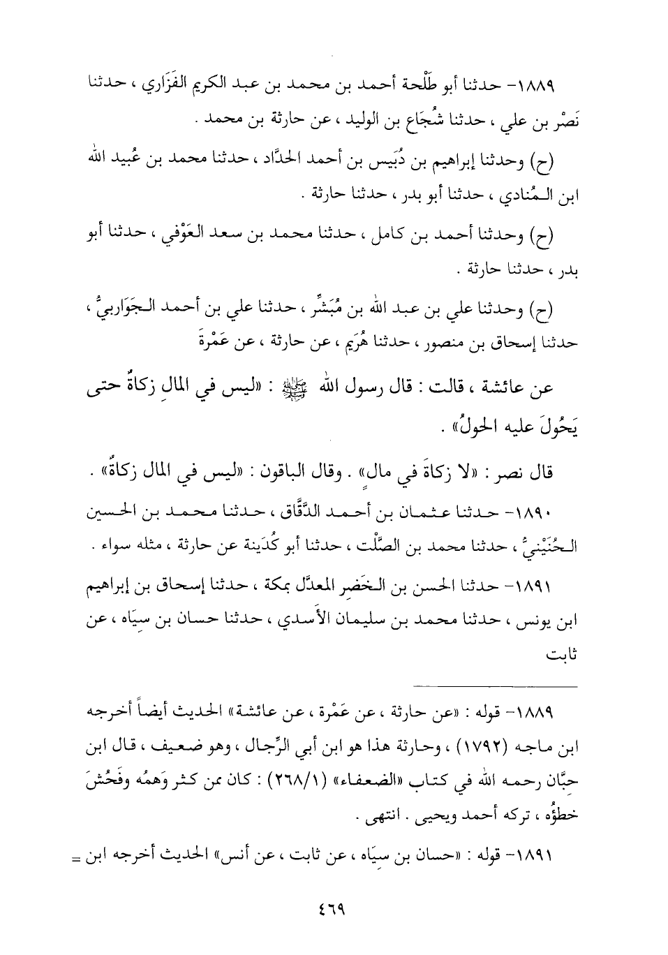 1889 - حَدَّثَنَا أَبُو طَلْحَةَ أَحْمَدُ بْنُ مُحَمَّدِ بْنِ عَبْدِ الْكَرِيمِ , ثنا نَصْرُ بْنُ عَلِيٍّ , ثنا شُجَاعُ بْنُ الْوَلِيدِ , عَنْ حَارِثَةَ بْنِ مُحَمَّدٍ , ح وَحَدَّثَنَا إِبْرَاهِيمُ بْنُ دُبَيْسِ بْنِ أَحْمَدَ الْحَدَّادُ , ثنا مُحَمَّدُ بْنُ عُبَيْدِ اللَّهِ بْنِ الْمُنَادِي , ثنا أَبُو بَدْرٍ , ثنا حَارِثَةُ , ح وَحَدَّثَنَا أَحْمَدُ بْنُ كَامِلٍ , ثنا مُحَمَّدُ بْنُ سَعْدٍ الْعَوْفِيُّ , ثنا أَبُو بَدْرٍ , نا حَارِثَةُ , ح وَحَدَّثَنَا عَلِيُّ بْنُ عَبْدِ اللَّهِ بْنِ مُبَشِّرٍ , ثنا عَلِيُّ بْنُ أَحْمَدَ الْجَوَارِبِيُّ , ثنا إِسْحَاقُ بْنُ مَنْصُورٍ , حَدَّثَنَا هُرَيْمٌ , عَنْ حَارِثَةَ , عَنْ عَمْرَةَ , عَنْ عَائِشَةَ , قَالَتْ: قَالَ رَسُولُ اللَّهِ صَلَّى اللهُ عَلَيْهِ وَسَلَّمَ: § «لَيْسَ فِي الْمَالِ زَكَاةٌ حَتَّى يَحُولَ عَلَيْهِ الْحَوْلُ». قَالَ نَصْرٌ: لَا زَكَاةَ فِي مَالٍ , وَقَالَ الْبَاقُونَ: لَيْسَ فِي الْمَالِ زَكَاةٌ.