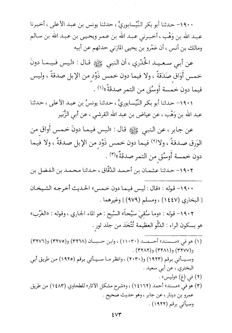 1900 - حَدَّثَنَا أَبُو بَكْرٍ النَّيْسَابُورِيُّ , ثنا يُونُسُ بْنُ عَبْدِ الْأَعْلَى , ثنا عَبْدُ اللَّهِ بْنُ وَهْبٍ , أَخْبَرَنِي عَبْدُ اللَّهِ بْنُ عُمَرَ , وَيَحْيَى بْنُ عَبْدِ اللَّهِ بْنِ سَالِمٍ , وَمَالِكُ بْنُ أَنَسٍ , أَنَّ عَمْرَو بْنَ يَحْيَى الْمَازِنِيَّ حَدَّثَهُمْ , عَنْ أَبِيهِ , عَنْ أَبِي سَعِيدٍ الْخُدْرِيِّ , أَنَّ النَّبِيَّ صَلَّى اللهُ عَلَيْهِ وَسَلَّمَ قَالَ: § «لَيْسَ فِيمَا دُونَ خَمْسِ أَوَاقٍ صَدَقَةٌ , وَلَا فِيمَا دُونَ خَمْسِ ذَوْدٍ مِنَ الْإِبِلِ صَدَقَةٌ , وَلَيْسَ فِيمَا دُونَ خَمْسَةِ أَوْسُقٍ مِنَ التَّمْرِ صَدَقَةٌ»