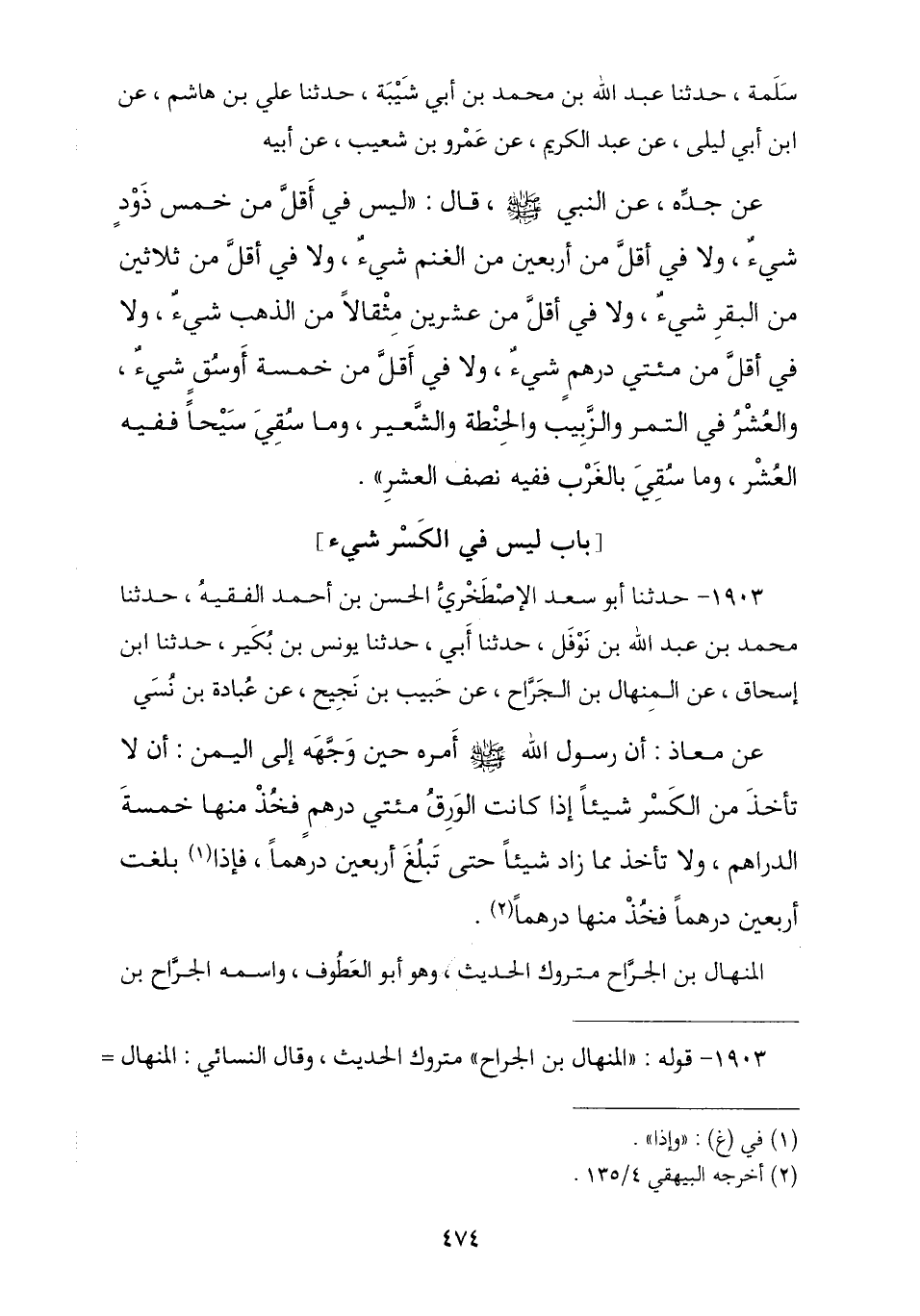 1903 - حَدَّثَنَا أَبُو سَعْدٍ الْإِصْطَخْرِيُّ الْحَسَنُ بْنُ أَحْمَدَ الْفَقِيهُ , ثنا مُحَمَّدُ بْنُ عَبْدِ اللَّهِ بْنِ نَوْفَلٍ , ثنا أَبِي , ثنا يُونُسُ بْنُ بُكَيْرٍ , ثنا ابْنُ إِسْحَاقَ , عَنِ الْمِنْهَالِ بْنِ الْجَرَّاحِ , عَنْ حَبِيبِ بْنِ نَجِيحٍ , عَنْ عُبَادَةَ بْنِ نَسِيٍّ , عَنْ مُعَاذٍ , أَنَّ رَسُولَ اللَّهِ صَلَّى اللهُ عَلَيْهِ وَسَلَّمَ أَمَرَهُ حِينَ وَجَّهَهُ إِلَى الْيَمَنِ: «أَنْ §لَا تَأْخُذَ مِنَ الْكَسْرِ شَيْئًا , إِذَا كَانَتِ الْوَرِقُ مِائَتَيْ دِرْهَمٍ فَخُذْ مِنْهَا خَمْسَةَ دَرَاهِمَ , وَلَا تَأْخُذْ مِمَّا زَادَ شَيْئًا حَتَّى تَبْلُغَ أَرْبَعِينَ دِرْهَمًا , وَإِذَا بَلَغَ أَرْبَعِينَ دِرْهَمًا فَخُذْ مِنْهُ دِرْهَمًا». الْمِنْهَالُ بْنُ الْجَرَّاحِ مَتْرُوكُ الْحَدِيثِ , وَهُوَ أَبُو الْعَطُوفِ وَاسْمُهُ الْجَرَّاحُ بْنُ -[475]- الْمِنْهَالِ , وَكَانَ ابْنُ إِسْحَاقَ يَقْلِبُ اسْمَهُ إِذَا رَوَى عَنْهُ , وَعُبَادَةُ بْنُ نَسِيٍّ لَمْ يَسْمَعْ مِنْ مُعَاذٍ