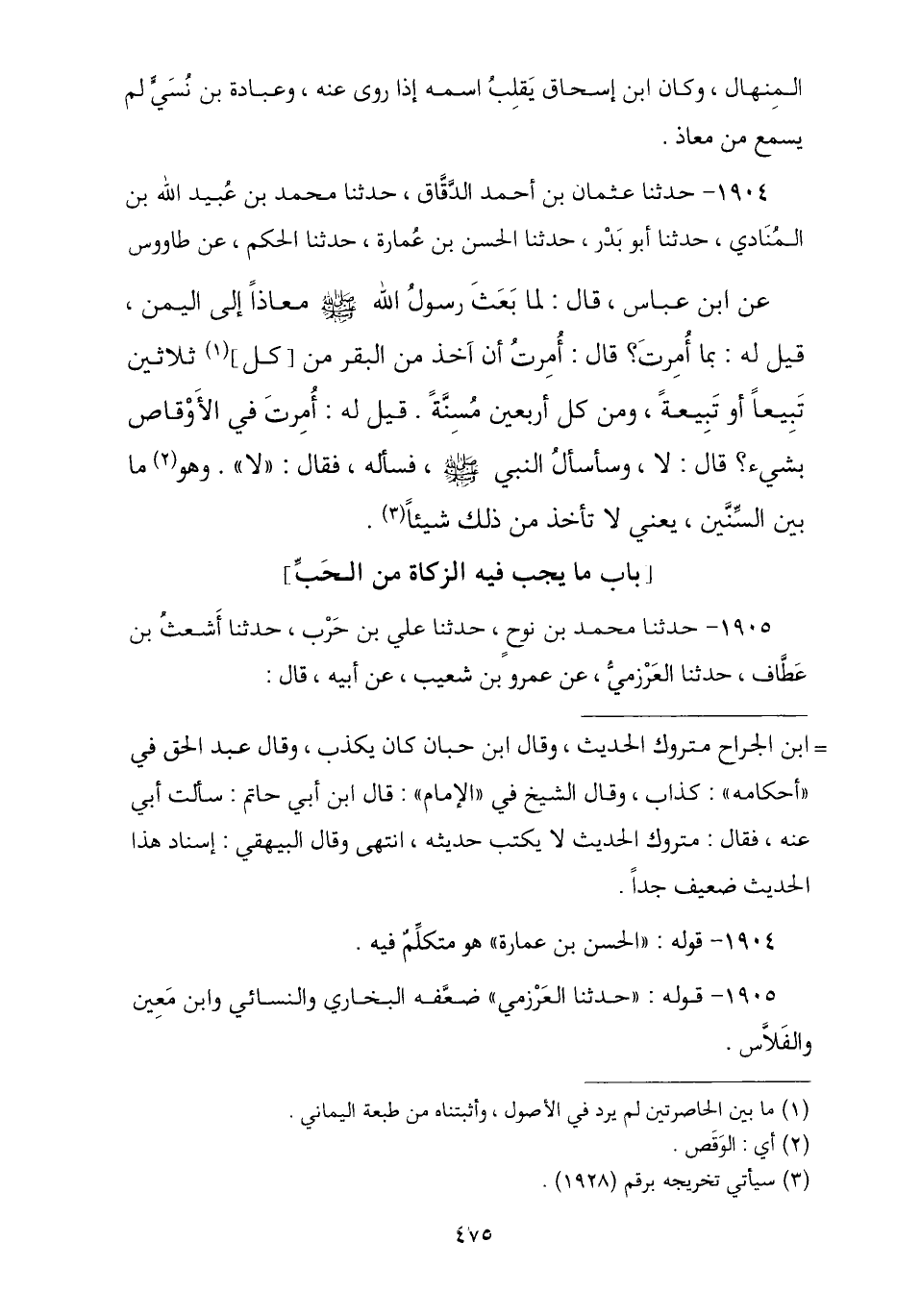 1904 - حَدَّثَنَا عُثْمَانُ بْنُ أَحْمَدَ الدَّقَّاقُ , ثنا مُحَمَّدُ بْنُ عُبَيْدِ اللَّهِ بْنِ الْمُنَادِي , ثنا أَبُو بَدْرٍ , ثنا الْحَسَنُ بْنُ عُمَارَةَ , ثنا الْحَكَمُ , عَنْ طَاوُسٍ , عَنِ ابْنِ عَبَّاسٍ , قَالَ: لَمَّا بَعَثَ رَسُولُ اللَّهِ صَلَّى اللهُ عَلَيْهِ وَسَلَّمَ مُعَاذًا إِلَى الْيَمَنِ قِيلَ لَهُ: بِمَا أُمِرْتَ؟ , قَالَ: «أُمِرْتُ أَنْ آخُذَ مِنَ الْبَقَرِ §مِنْ كُلِّ ثَلَاثِينَ تَبِيعًا أَوْ تَبِيعَةً وَمِنْ كُلِّ أَرْبَعِينَ مُسِنَّةً» , قِيلَ لَهُ: أُمِرْتَ فِي الْأَوْقَاصِ بِشَيْءٍ؟ , قَالَ: " لَا وَسَأَسْأَلُ النَّبِيَّ صَلَّى اللهُ عَلَيْهِ وَسَلَّمَ فَسَأَلَهُ , فَقَالَ: «لَا وَهُوَ مَا بَيْنَ السِّنِينَ». يَعْنِي لَا تَأْخُذْ مِنْ ذَلِكَ شَيْئًا