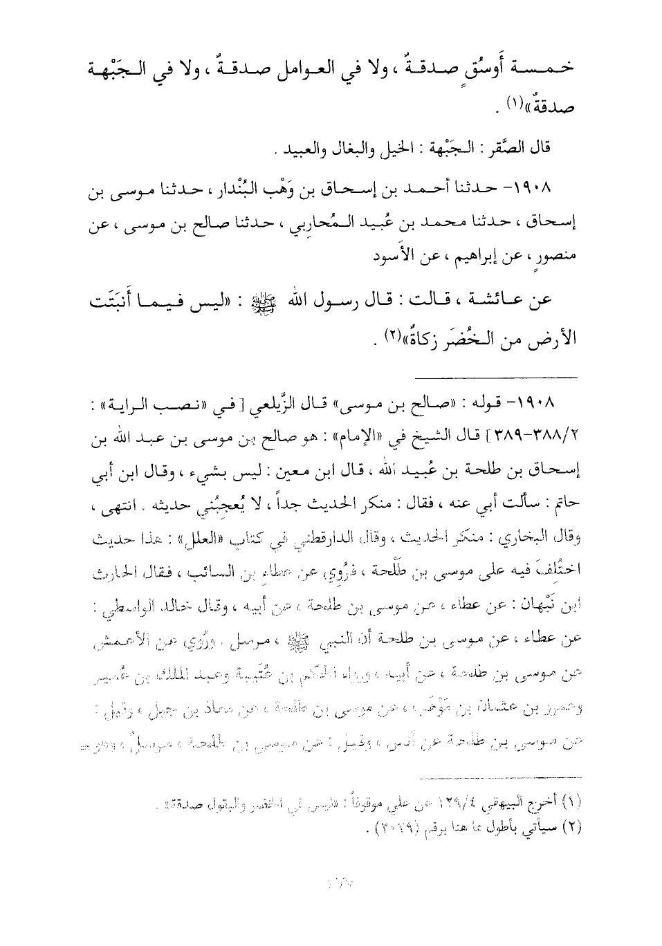1908 - حَدَّثَنَا أَحْمَدُ بْنُ إِسْحَاقَ بْنِ وَهْبٍ الْبُنْدَارُ , نا مُوسَى بْنُ إِسْحَاقَ , نا مُحَمَّدُ بْنُ عُبَيْدٍ الْمُحَارِبِيُّ , ثنا صَالِحُ بْنُ مُوسَى , عَنْ مَنْصُورٍ , عَنْ إِبْرَاهِيمَ , عَنِ الْأَسْوَدِ , عَنْ عَائِشَةَ , قَالَتْ: قَالَ رَسُولُ اللَّهِ صَلَّى اللهُ عَلَيْهِ وَسَلَّمَ: § «لَيْسَ فِيمَا أَنْبَتَتِ الْأَرْضُ مِنَ الْخَضِرِ زَكَاةٌ»