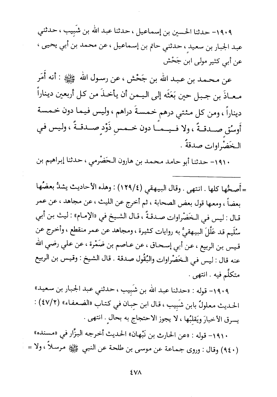 1909 - حَدَّثَنَا الْحُسَيْنُ بْنُ إِسْمَاعِيلَ , ثنا عَبْدُ اللَّهِ بْنُ شَبِيبٍ , حَدَّثَنِي عَبْدُ الْجَبَّارِ بْنُ سَعِيدٍ , حَدَّثَنِي حَاتِمُ بْنُ إِسْمَاعِيلَ , عَنْ مُحَمَّدِ بْنِ أَبِي يَحْيَى , عَنْ أَبِي كَثِيرٍ مَوْلَى بَنِي جَحْشٍ , عَنْ مُحَمَّدِ بْنِ عَبْدِ اللَّهِ بْنِ جَحْشٍ , عَنْ رَسُولِ اللَّهِ صَلَّى اللهُ عَلَيْهِ وَسَلَّمَ أَنَّهُ أَمَرَ مُعَاذَ بْنَ جَبَلٍ حِينَ بَعَثَهُ إِلَى الْيَمَنِ: «أَنْ يَأْخُذَ مِنْ كُلِّ أَرْبَعِينَ دِينَارًا دِينَارًا , وَمِنْ كُلِّ مِائَتَيْ دِرْهَمٍ خَمْسَةَ دَرَاهِمَ , §وَلَيْسَ فِيمَا دُونَ خَمْسَةِ أَوْسُقٍ صَدَقَةٌ , وَلَا فِيمَا دُونَ خَمْسِ ذَوْدٍ صَدَقَةٌ , وَلَيْسَ فِي الْخَضْرَاوَاتِ صَدَقَةٌ»