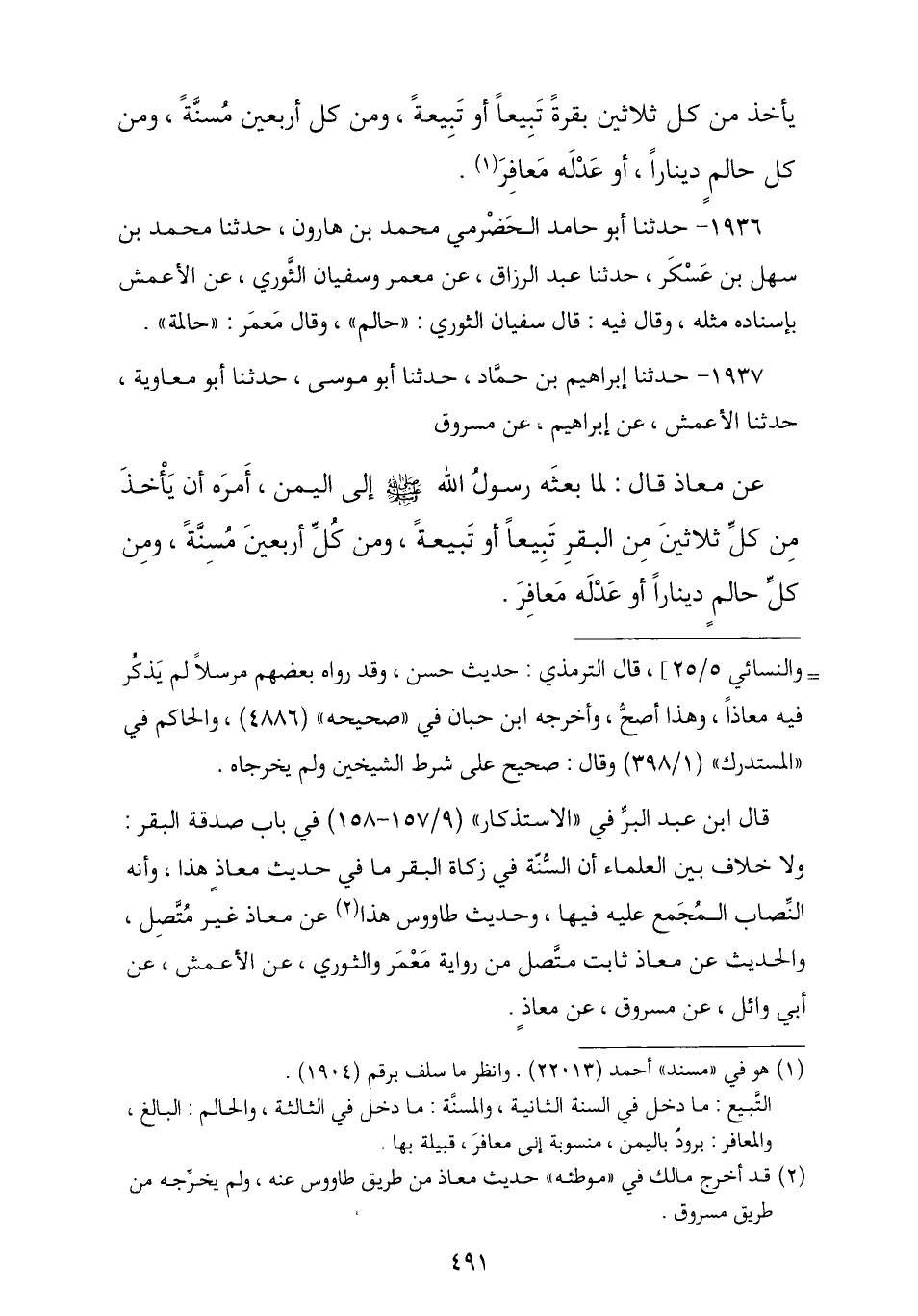 1937 - حَدَّثَنَا إِبْرَاهِيمُ بْنُ حَمَّادٍ , ثنا أَبُو مُوسَى , ثنا أَبُو مُعَاوِيَةَ , ثنا الْأَعْمَشُ , عَنْ إِبْرَاهِيمَ , عَنْ مَسْرُوقٍ , عَنْ مُعَاذٍ , قَالَ: لَمَّا بَعَثَهُ رَسُولُ اللَّهِ صَلَّى اللهُ عَلَيْهِ وَسَلَّمَ إِلَى الْيَمَنِ «أَمَرَهُ أَنْ يَأْخُذَ §مِنْ كُلِّ ثَلَاثِينَ مِنَ الْبَقَرِ تَبِيعًا أَوْ تَبِيعَةً , وَمِنْ أَرْبَعِينَ مُسِنَّةً , وَمِنْ كُلِّ حَالِمٍ دِينَارًا أَوْ عِدْلَهُ مَعَافِرَ»