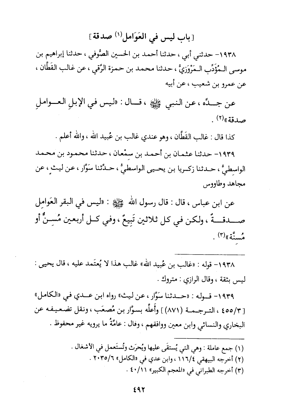 1938 - حَدَّثَنِي أَبِي , ثنا أَحْمَدُ بْنُ الْحَسَنِ الصُّوفِيُّ , ثنا إِبْرَاهِيمُ بْنُ مُوسَى الْمُؤَدِّبُ الْمَرْوَزِيُّ , نا مُحَمَّدُ بْنُ حَمْزَةَ الرَّقِّيُّ , عَنْ غَالِبٍ الْقَطَّانِ , عَنْ عَمْرِو بْنِ شُعَيْبٍ , عَنْ أَبِيهِ , عَنْ جَدِّهِ , عَنِ النَّبِيِّ صَلَّى اللهُ عَلَيْهِ وَسَلَّمَ قَالَ: § «لَيْسَ فِي الْإِبِلِ الْعَوَامِلِ صَدَقَةٌ». كَذَا قَالَ غَالِبٌ الْقَطَّانُ وَهُوَ عِنْدِي غَالِبُ بْنُ عُبَيْدِ اللَّهِ وَاللَّهُ أَعْلَمُ