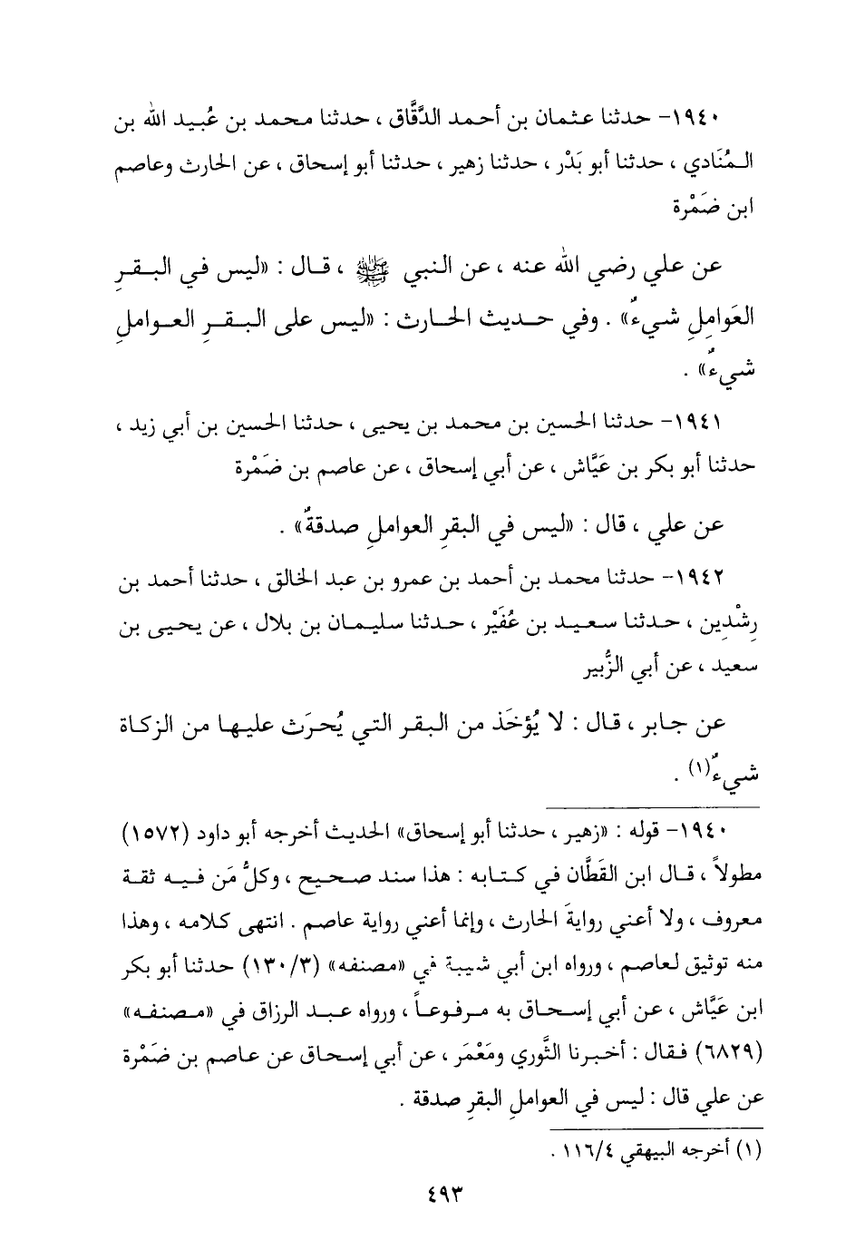 1940 - حَدَّثَنَا عُثْمَانُ بْنُ أَحْمَدَ الدَّقَّاقُ , ثنا مُحَمَّدُ بْنُ عُبَيْدِ اللَّهِ بْنِ الْمُنَادِي , ثنا أَبُو بَدْرٍ , ثنا زُهَيْرٌ , ثنا أَبُو إِسْحَاقَ , عَنِ الْحَارِثِ , وَعَاصِمِ بْنِ ضَمْرَةَ , عَنْ عَلِيٍّ , عَنِ النَّبِيِّ صَلَّى اللهُ عَلَيْهِ وَسَلَّمَ قَالَ: § «لَيْسَ في الْبَقَرِ الْعَوَامِلِ شَيْءٌ» وَفِي حَدِيثِ الْحَارِثِ «لَيْسَ عَلَى الْبَقَرِ الْعَوَامِلِ شَيْءٌ»