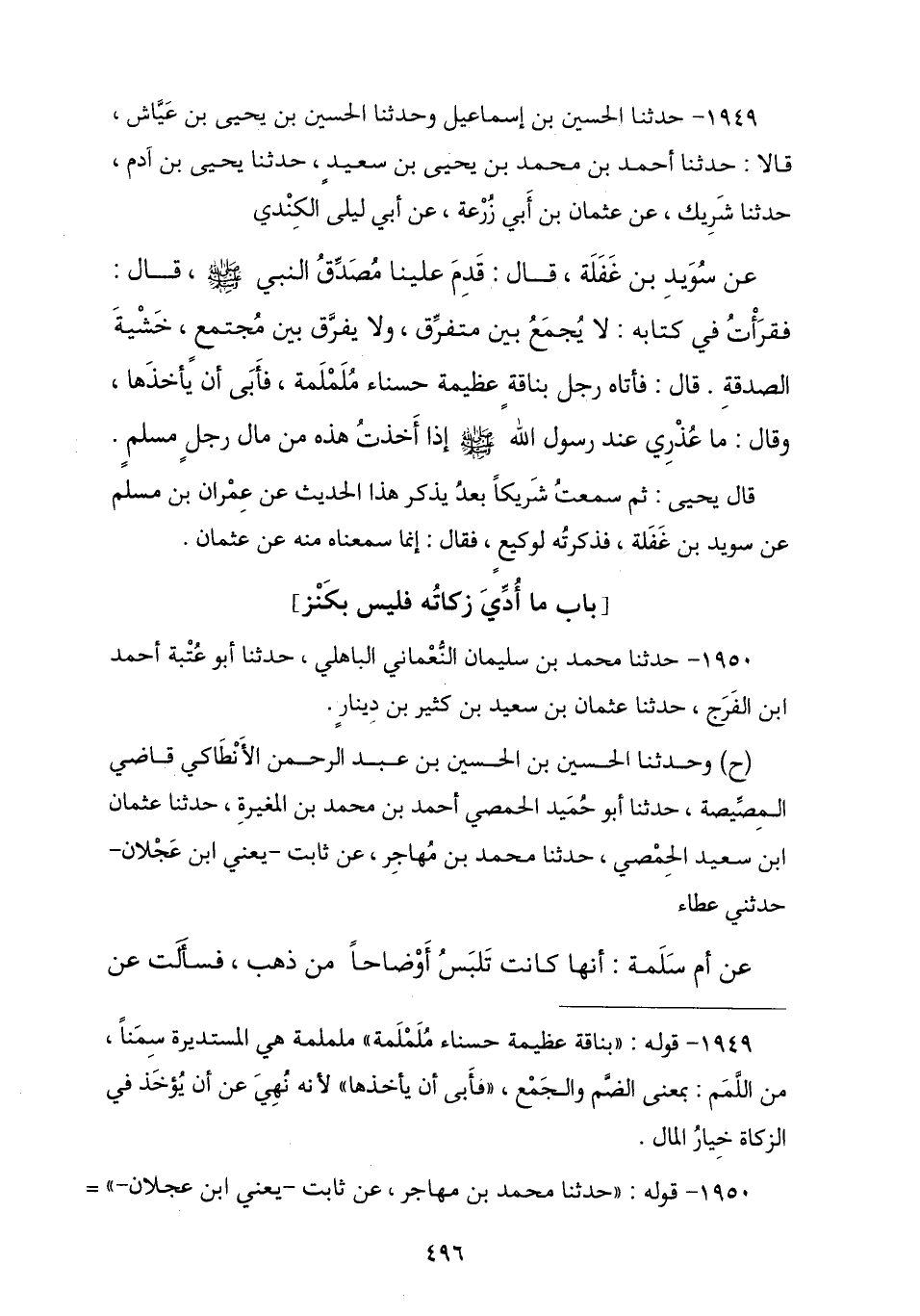 1949 - حَدَّثَنَا الْحُسَيْنُ بْنُ إِسْمَاعِيلَ , وَالْحُسَيْنُ بْنُ يَحْيَى بْنِ عَيَّاشٍ , قَالَا: نا أَحْمَدُ بْنُ مُحَمَّدِ بْنِ يَحْيَى بْنِ سَعِيدٍ , ثنا يَحْيَى بْنُ آدَمَ , ثنا شَرِيكٌ , عَنْ عُثْمَانَ بْنِ أَبِي زُرْعَةَ , عَنْ أَبِي لَيْلَى الْكِنْدِيِّ , عَنْ سُوَيْدِ بْنِ غَفَلَةَ , قَالَ: قَدِمَ عَلَيْنَا مُصَدِّقُ رَسُولِ اللَّهِ صَلَّى اللهُ عَلَيْهِ وَسَلَّمَ قَالَ: فَقَرَأْتُ فِي كِتَابِهِ: § «لَا يُجْمَعُ بَيْنَ مُتَفَرِّقٍ وَلَا يُفَرَّقُ بَيْنَ مُجْتَمِعٍ خَشْيَةَ الصَّدَقَةِ» , قَالَ: فَأَتَاهُ رَجُلٌ بِنَاقَةٍ عَظِيمَةٍ حَسْنَاءَ مُلَمْلَمَةٍ , فَأَبَى أَنْ يَأْخُذَهَا وَقَالَ: مَا عُذْرِي عِنْدَ رَسُولِ اللَّهِ صَلَّى اللهُ عَلَيْهِ وَسَلَّمَ إِذَا أَخَذْتُ هَذِهِ مِنْ مَالِ رَجُلٍ مُسْلِمٍ؟. قَالَ يَحْيَى: ثُمَّ سَمِعْتُ شَرِيكًا بَعْدُ يَذْكُرُ هَذَا الْحَدِيثَ , عَنْ عِمْرَانَ بْنِ مُسْلِمٍ , عَنْ سُوَيْدِ بْنِ غَفَلَةَ , فَذَكَرْتُهُ لِوَكِيعٍ , فَقَالَ: إِنَّمَا سَمِعْنَاهُ مِنْهُ عَنْ عُثْمَانَ