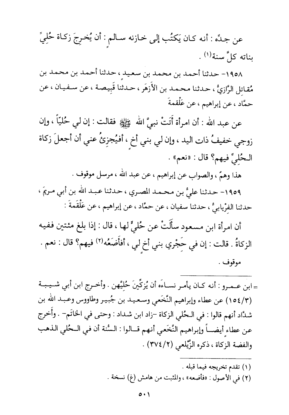 1958 - حَدَّثَنَا أَحْمَدُ بْنُ مُحَمَّدِ بْنِ سَعِيدٍ , نا أَحْمَدُ بْنُ مُحَمَّدِ بْنِ مُقَاتِلٍ الرَّازِيُّ , ثنا مُحَمَّدُ بْنُ الْأَزْهَرِ , ثنا قَبِيصَةُ , عَنْ سُفْيَانَ , عَنْ حَمَّادٍ , عَنْ إِبْرَاهِيمَ , عَنْ عَلْقَمَةَ , عَنْ عَبْدِ اللَّهِ أَنَّ امْرَأَةً أَتَتِ النَّبِيَّ صَلَّى اللهُ عَلَيْهِ وَسَلَّمَ , فَقَالَتْ: §إِنَّ لِي حُلِيًّا وَإِنَّ زَوْجِي خَفِيفُ ذَاتِ الْيَدِ , وَأَنَّ لِي بَنِي أَخٍ أَفَيُجْزِي عَنِّي أَنْ أَجْعَلَ زَكَاةَ الْحُلِيِّ فِيهِمْ؟ , قَالَ: «نَعَمْ». هَذَا وَهْمٌ وَالصَّوَابُ عَنْ إِبْرَاهِيمَ , عَنْ عَبْدِ اللَّهِ هَذَا مُرْسَلٌ مَوْقُوفٌ