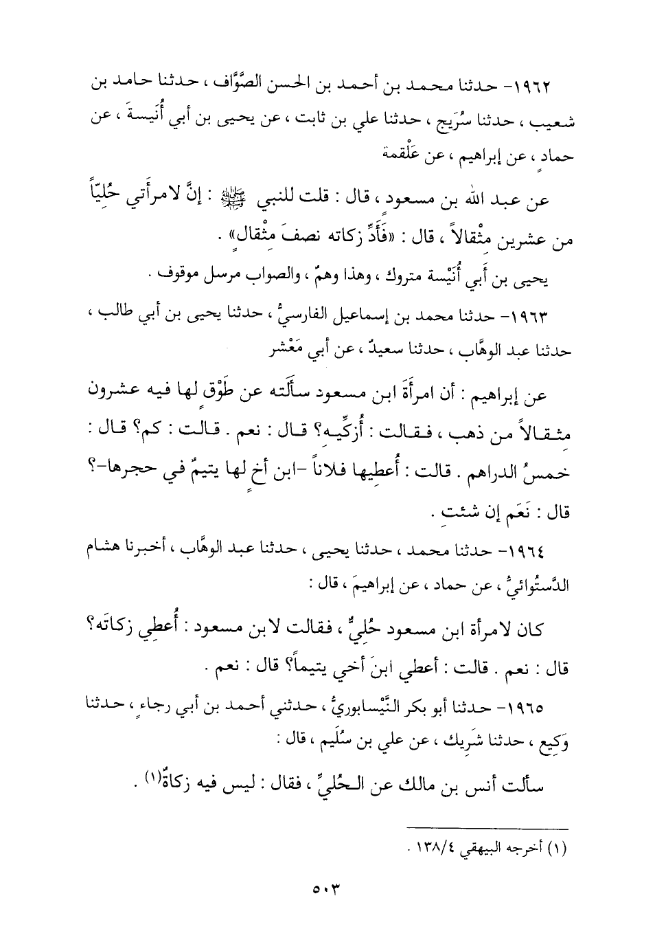 1963 - حَدَّثَنَا مُحَمَّدُ بْنُ إِسْمَاعِيلَ الْفَارِسِيُّ , ثنا يَحْيَى بْنُ أَبِي طَالِبٍ , ثنا عَبْدُ الْوَهَّابِ , ثنا سَعِيدٌ , عَنْ أَبِي مَعْشَرٍ , عَنْ إِبْرَاهِيمَ , أَنَّ امْرَأَةَ ابْنِ مَسْعُودٍ سَأَلَتْهُ عَنْ طَوْقٍ لَهَا فِيهِ عِشْرُونَ مِثْقَالًا مِنَ الذَّهَبِ , فَقَالَتْ: §أُزَكِّيهِ؟ , قَالَ: «نَعَمْ» , قَالَتْ: كَمْ؟ , قَالَ: «خَمْسَةُ دَرَاهِمَ» , قَالَتْ: أُعْطِيَهَا فُلَانًا , ابْنُ أَخٍ لَهَا يَتِيمٌ فِي حِجْرِهَا , قَالَ: «نَعَمْ إِنْ شِئْتِ»