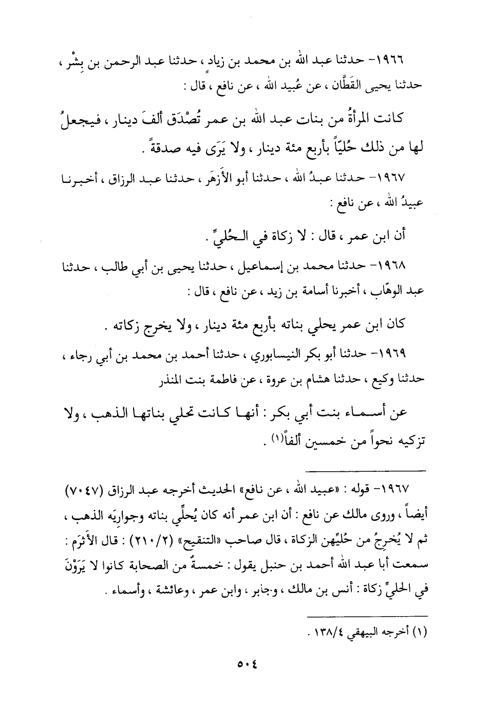 1968 - حَدَّثَنَا مُحَمَّدُ بْنُ إِسْمَاعِيلَ , ثنا يَحْيَى بْنُ أَبِي طَالِبٍ , ثنا عَبْدُ الْوَهَّابِ , ثنا أُسَامَةُ بْنُ زَيْدٍ , عَنْ نَافِعٍ , قَالَ: كَانَ ابْنُ عُمَرَ § «يُحَلِّي بَنَاتَهُ بِأَرْبَعِمِائَةِ دِينَارٍ وَلَا يُخْرِجُ زَكَاتَهُ»