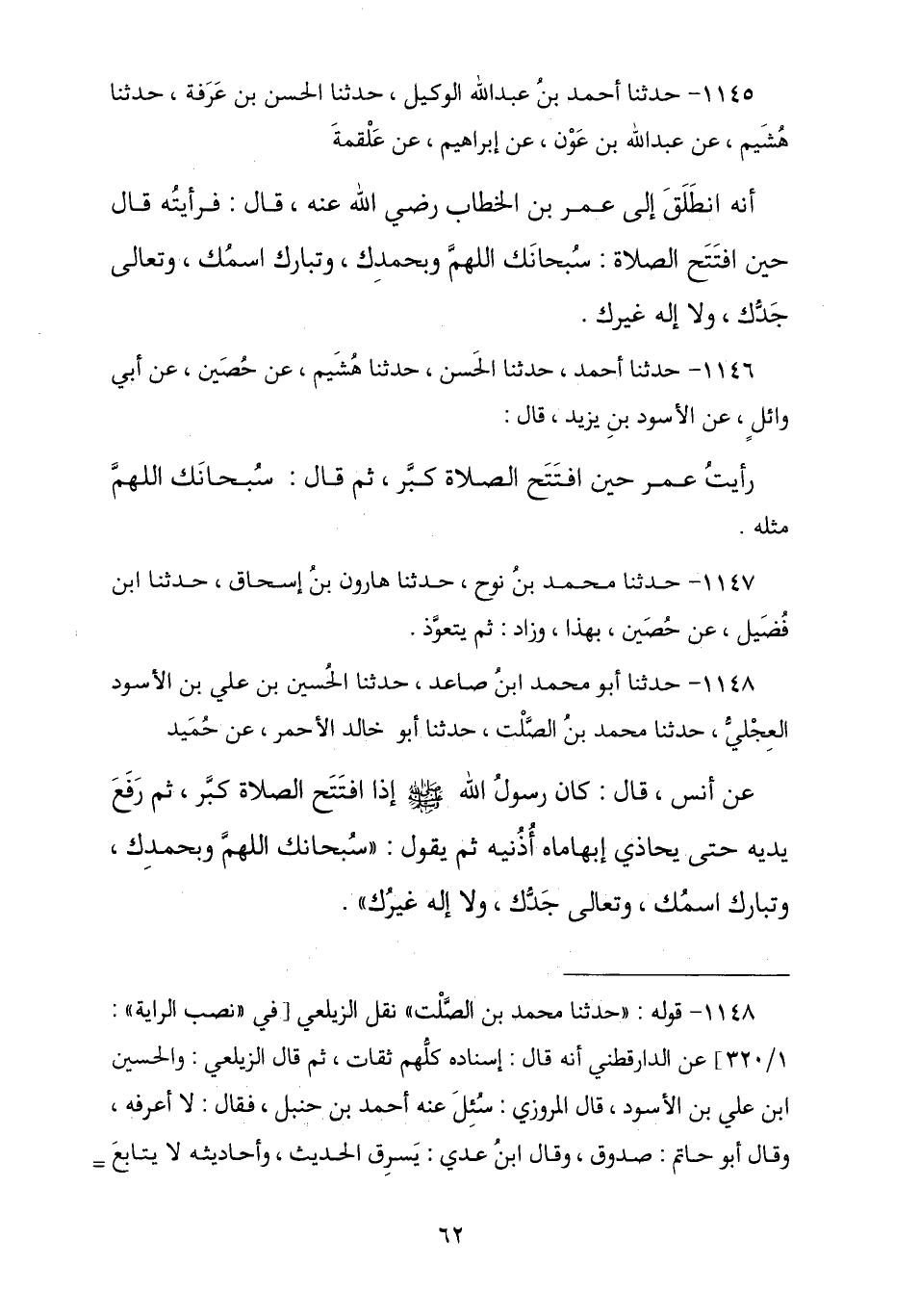 1145 - حَدَّثَنَا أَحْمَدُ بْنُ عَبْدِ اللَّهِ الْوَكِيلُ , ثنا الْحَسَنُ بْنُ عَرَفَةَ , ثنا هُشَيْمٌ , عَنْ عَبْدِ اللَّهِ بْنِ عَوْنٍ , عَنْ إِبْرَاهِيمَ , عَنْ عَلْقَمَةَ , أَنَّهُ انْطَلَقَ إِلَى عُمَرَ بْنِ الْخَطَّابِ قَالَ فَرَأَيْتُهُ قَالَ حِينَ افْتَتَحَ الصَّلَاةَ: § «سُبْحَانَكَ اللَّهُمَّ وَبِحَمْدِكَ وَتَبَارَكَ اسْمُكَ وَتَعَالَى جَدُّكَ وَلَا إِلَهَ غَيْرُكَ».