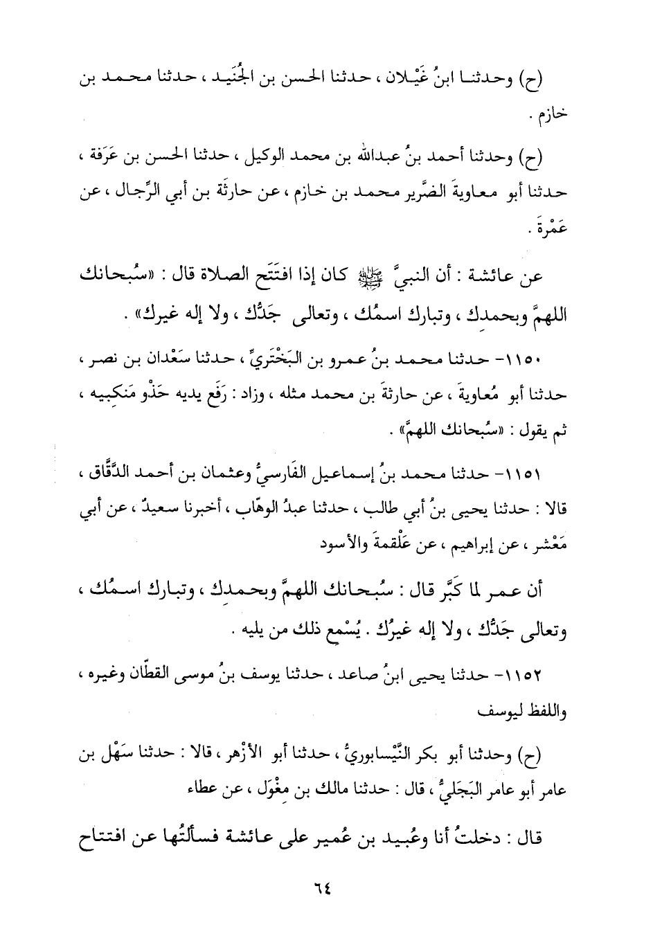 1151 - حَدَّثَنَا مُحَمَّدُ بْنُ إِسْمَاعِيلَ الْفَارِسِيُّ , وَعُثْمَانُ بْنُ أَحْمَدَ الدَّقَّاقُ , قَالَا: نا يَحْيَى بْنُ أَبِي طَالِبٍ , ثنا عَبْدُ الْوَهَّابِ , أنا سَعِيدٌ , عَنْ أَبِي مَعْشَرٍ , عَنْ إِبْرَاهِيمَ , عَنْ عَلْقَمَةَ , وَالْأَسْوَدِ , أَنَّ عُمَرَ رَضِيَ اللَّهُ عَنْهُ لَمَّا كَبَّرَ , قَالَ: § «سُبْحَانَكَ اللَّهُمَّ وَبِحَمْدِكَ وَتَبَارَكَ اسْمُكَ وَتَعَالَى جَدُّكَ وَلَا إِلَهَ غَيْرُكَ». يَسْمَعُ ذَلِكَ مَنْ يَلِيهِ