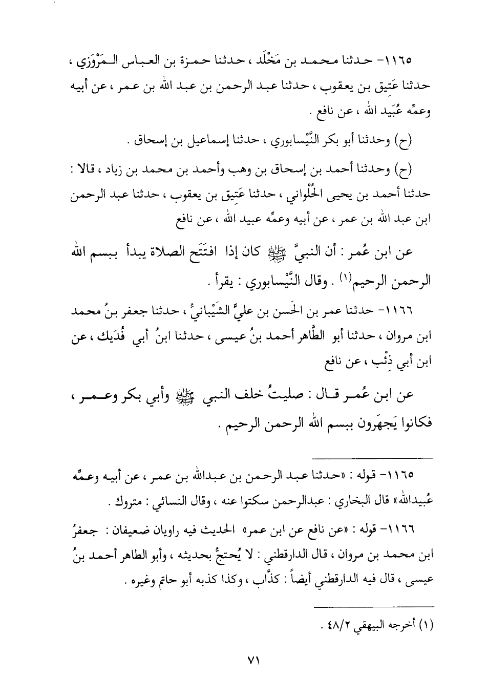 1165 - وَحَدَّثَنَا أَبُو بَكْرٍ النَّيْسَابُورِيُّ , ثنا إِسْمَاعِيلُ بْنُ إِسْحَاقَ , وَحَدَّثَنَا أَحْمَدُ بْنُ إِسْحَاقَ بْنِ وَهْبٍ , وَأَحْمَدُ بْنُ مُحَمَّدِ بْنِ زِيَادٍ , قَالَا: نا أَحْمَدُ بْنُ يَحْيَى الْحُلْوَانِيُّ , قَالَا: نا عُثْمَانُ بْنُ يَعْقُوبَ ح وَحَدَّثَنَا مُحَمَّدُ بْنُ مَخْلَدٍ , نا حَمْزَةُ بْنُ الْعَبَّاسِ الْمَرْوَزِيُّ , ثنا عَتِيقُ بْنُ يَعْقُوبَ , ثنا عَبْدُ الرَّحْمَنِ بْنُ عَبْدِ اللَّهِ بْنِ عُمَرَ , عَنْ أَبِيهِ , وَعَمِّهِ عُبَيْدِ اللَّهِ , عَنْ نَافِعٍ , عَنِ ابْنِ عُمَرَ , أَنَّ النَّبِيَّ صَلَّى اللهُ عَلَيْهِ وَسَلَّمَ كَانَ " §إِذَا افْتَتَحَ الصَّلَاةَ يَبْدَأُ بِـ {بِسْمِ اللَّهِ الرَّحْمَنِ الرَّحِيمِ} [الفاتحة: 1] ". وَقَالَ النَّيْسَابُورِيُّ: يَقْرَأُ