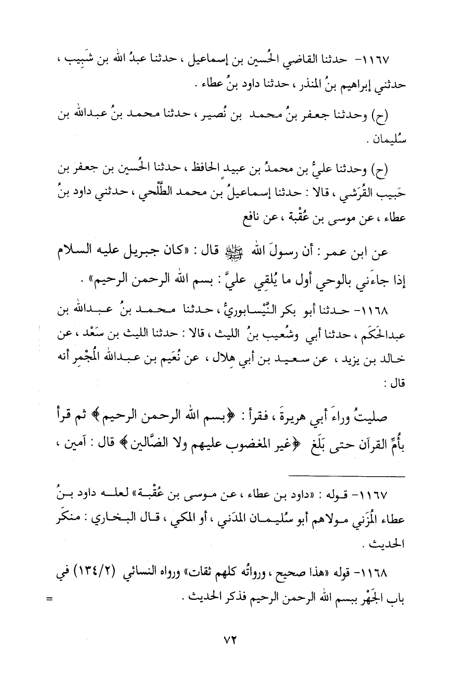1167 - حَدَّثَنَا الْحُسَيْنُ بْنُ إِسْمَاعِيلَ , ثنا عَبْدُ اللَّهِ بْنُ شَبِيبٍ , حَدَّثَنَا إِبْرَاهِيمُ بْنُ الْمُنْذِرِ , ثنا دَاوُدُ بْنُ عَطَاءٍ , ح وَحَدَّثَنَا جَعْفَرُ بْنُ مُحَمَّدِ بْنِ نُصَيْرٍ , ثنا مُحَمَّدُ بْنُ عَبْدِ اللَّهِ بْنِ سُلَيْمَانَ , ح وَحَدَّثَنَا عَلِيُّ بْنُ مُحَمَّدِ بْنِ عُبَيْدِ اللَّهِ الْحَافِظُ , ثنا الْحُسَيْنُ بْنُ جَعْفَرِ بْنِ حَبِيبٍ الْقُرَشِيُّ , قَالَا: نا إِسْمَاعِيلُ بْنُ مُحَمَّدٍ الطَّلْحِيُّ , حَدَّثَنِي دَاوُدُ بْنُ عَطَاءٍ , عَنْ مُوسَى بْنِ عُقْبَةَ , عَنْ نَافِعٍ , عَنِ ابْنِ عُمَرَ , أَنَّ رَسُولَ اللَّهِ صَلَّى اللهُ عَلَيْهِ وَسَلَّمَ قَالَ: " كَانَ جَبْرَائِيلُ عَلَيْهِ السَّلَامُ إِذَا جَاءَنِي بِالْوَحْيِ §أَوَّلَ مَا يُلْقِي عَلَيَّ: {بِسْمِ اللَّهِ الرَّحْمَنِ الرَّحِيمِ} [الفاتحة: 1] "