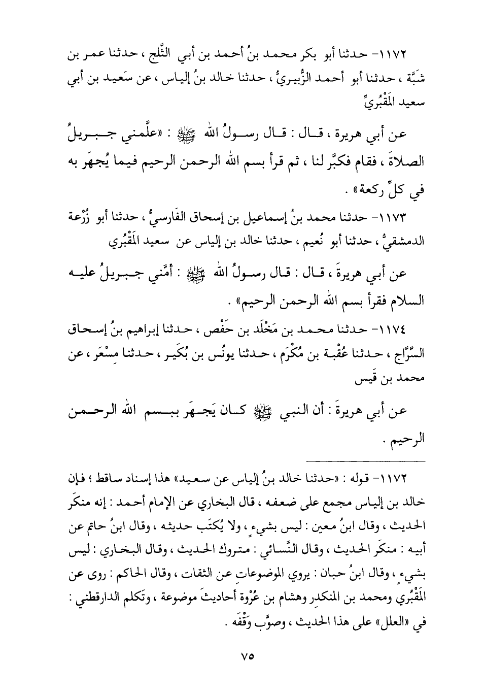 1172 - حَدَّثَنَا أَبُو بَكْرٍ مُحَمَّدُ بْنُ أَحْمَدَ بْنِ أَبِي الثَّلْجٍ , ثنا عُمَرُ بْنُ شَبَّةَ , ثنا أَبُو أَحْمَدَ الزُّبَيْرِيُّ , ثنا خَالِدُ بْنُ إِلْيَاسَ , عَنْ سَعِيدِ بْنِ أَبِي سَعِيدٍ الْمَقْبُرِيِّ , عَنْ أَبِي هُرَيْرَةَ , قَالَ: قَالَ رَسُولُ اللَّهِ صَلَّى اللهُ عَلَيْهِ وَسَلَّمَ: §" عَلَّمَنِي جَبْرَائِيلُ عَلَيْهِ السَّلَامُ الصَّلَاةَ فَقَامَ فَكَبَّرَ لَنَا ثُمَّ قَرَأَ {بِسْمِ اللَّهِ الرَّحْمَنِ الرَّحِيمِ} [الفاتحة: 1] , فِيمَا يُجْهَرُ بِهِ فِي كُلِّ رَكْعَةٍ "