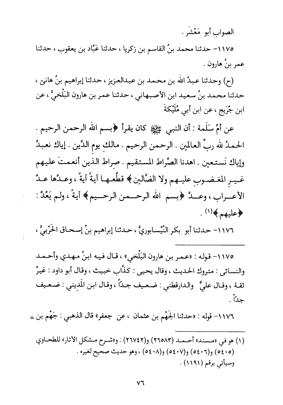 1175 - حَدَّثَنَا مُحَمَّدُ بْنُ الْقَاسِمِ بْنِ زَكَرِيَّا , ثنا عَبَّادُ بْنُ يَعْقُوبَ , ثنا عُمَرُ بْنُ هَارُونَ , ح وَحَدَّثَنَا عَبْدُ اللَّهِ بْنُ مُحَمَّدِ بْنِ عَبْدِ الْعَزِيزِ , نا إِبْرَاهِيمُ بْنُ هَانِئٍ , ثنا مُحَمَّدُ بْنُ سَعِيدٍ الْأَصْبَهَانِيُّ , نا عُمَرُ بْنُ هَارُونَ الْبَلْخِيُّ , عَنِ ابْنِ جُرَيْجٍ , عَنِ ابْنِ أَبِي مُلَيْكَةَ , عَنْ أُمِّ سَلَمَةَ , أَنَّ النَّبِيَّ صَلَّى اللهُ عَلَيْهِ وَسَلَّمَ " كَانَ §يَقْرَأُ {بِسْمِ اللَّهِ الرَّحْمَنِ الرَّحِيمِ الْحَمْدُ لِلَّهِ رَبِّ الْعَالَمِينَ الرَّحْمَنِ الرَّحِيمِ مَالِكِ يَوْمِ الدِّينِ إِيَّاكَ نَعْبُدُ وَإِيَّاكَ نَسْتَعِينُ اهْدِنَا الصِّرَاطَ الْمُسْتَقِيمَ صِرَاطَ الَّذِينَ أَنْعَمْتَ عَلَيْهِمْ غَيْرِ الْمَغْضُوبِ عَلَيْهِمْ وَلَا الضَّالِّينَ} فَقَطَعَهَا آيَةً آيَةً وَعَدَّهَا عَدَّ الْأَعْرَابِ , وَعَدَّ {بِسْمِ اللَّهِ الرَّحْمَنِ الرَّحِيمِ} [الفاتحة: 1] آيَةً وَلَمْ يَعُدَّ: {عَلَيْهِمْ} [الفاتحة: 7] "