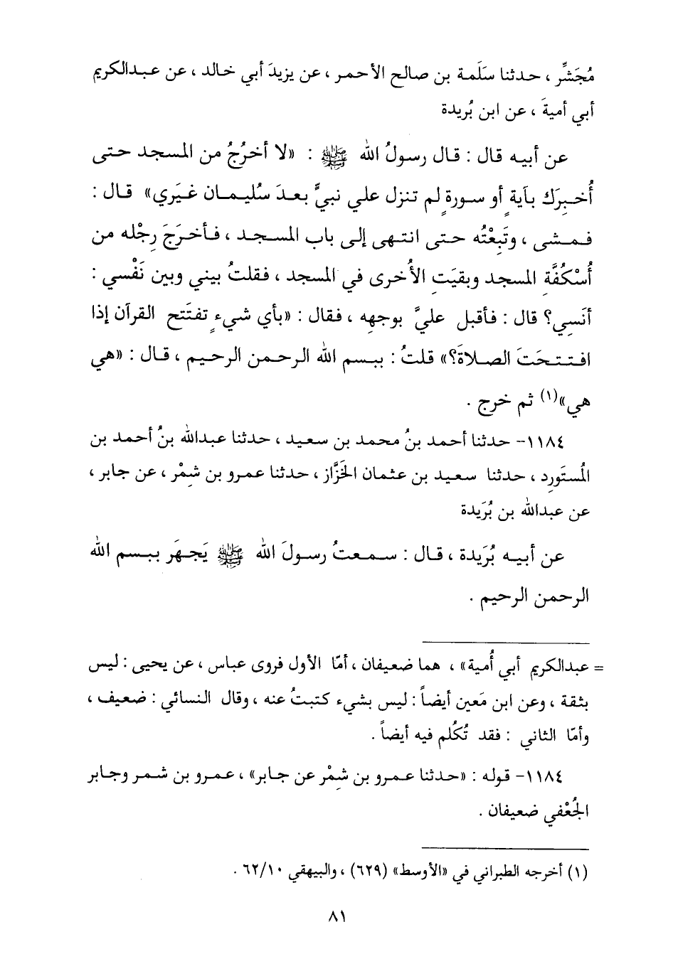 1184 - حَدَّثَنَا أَحْمَدُ بْنُ مُحَمَّدِ بْنِ سَعِيدٍ , ثنا عَبْدُ اللَّهِ بْنُ أَحْمَدَ بْنِ الْمُسْتَوْرِدِ , ثنا سَعِيدُ بْنُ عُثْمَانَ الْحَزَّازُ , حَدَّثَنَا عَمْرُو بْنُ شِمْرٍ , عَنْ جَابِرٍ , عَنْ عَبْدِ اللَّهِ بْنِ بُرَيْدَةَ , عَنْ أَبِيهِ بُرَيْدَةَ , قَالَ: سَمِعْتُ رَسُولَ اللَّهِ صَلَّى اللهُ عَلَيْهِ وَسَلَّمَ " §يَجْهَرُ بِـ {بِسْمِ اللَّهِ الرَّحْمَنِ الرَّحِيمِ} [الفاتحة: 1] ". -[82]- قَالَ عَبْدُ اللَّهِ: وَكَانَ عَبْدُ اللَّهِ بْنُ عُمَرَ يَجْهَرُ بِهَا , وَعَبْدُ اللَّهِ بْنُ الْعَبَّاسِ وَابْنُ الْحَنَفِيَّةِ