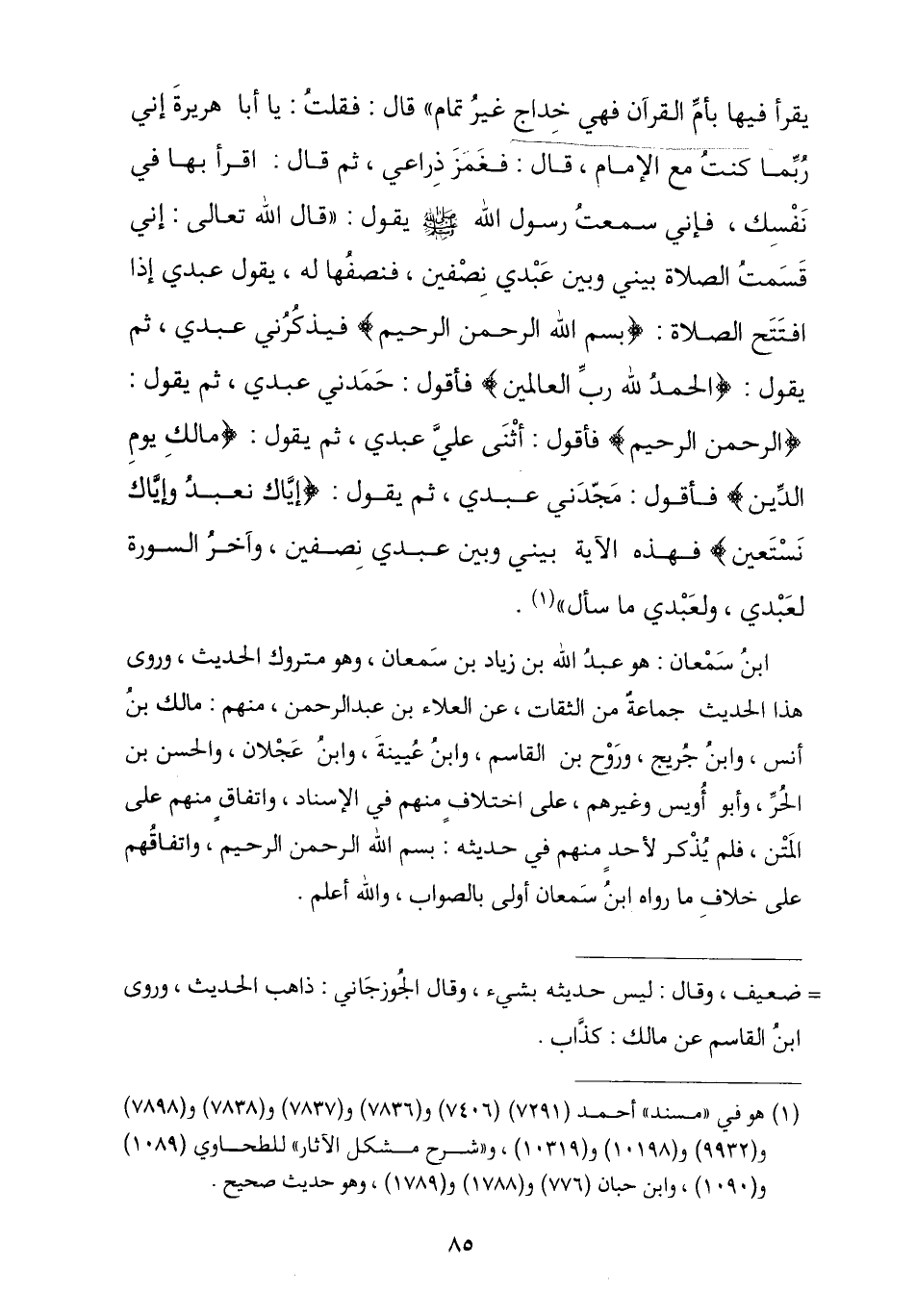 فَإِنِّي سَمِعْتُ رَسُولَ اللَّهِ صَلَّى اللهُ عَلَيْهِ وَسَلَّمَ يَقُولُ: " قَالَ اللَّهُ عَزَّ وَجَلَّ: إِنِّي §قَسَمْتُ الصَّلَاةَ بَيْنِي وَبَيْنَ عَبْدِي نِصْفَيْنِ فَنِصْفُهَا لَهُ , يَقُولُ عَبْدِي إِذَا افْتَتَحَ الصَّلَاةَ: {بِسْمِ اللَّهِ الرَّحْمَنِ الرَّحِيمِ} [الفاتحة: 1] فَيَذْكُرُنِي عَبْدِي , ثُمَّ يَقُولُ: {الْحَمْدُ لِلَّهِ رَبِّ الْعَالَمِينَ} [الفاتحة: 2] فَأَقُولُ: حَمِدَنِي عَبْدِي , ثُمَّ يَقُولُ: {الرَّحْمَنِ الرَّحِيمِ} [الفاتحة: 1] فَأَقُولُ: أَثْنَى عَلَيَّ عَبْدِي , ثُمَّ يَقُولُ: {مَالِكِ يَوْمِ الدِّينِ} فَأَقُولُ: مَجَّدَنِي عَبْدِي , ثُمَّ يَقُولُ: {إِيَّاكَ نَعْبُدُ وَإِيَّاكَ نَسْتَعِينُ} [الفاتحة: 5] فَهَذِهِ الْآيَةُ بَيْنِي وَبَيْنَ عَبْدِي نِصْفَيْنِ , وَآخِرُ السُّورَةِ لِعَبْدِي وَلِعَبْدِي مَا سَأَلَ ". ابْنُ سَمْعَانَ هُوَ عَبْدُ اللَّهِ بْنُ زِيَادِ بْنِ سَمْعَانَ مَتْرُوكُ الْحَدِيثِ , وَرَوَى هَذَا الْحَدِيثَ جَمَاعَةٌ مِنَ الثِّقَاتِ , عَنِ الْعَلَاءِ بْنِ عَبْدِ الرَّحْمَنِ مِنْهُمْ: مَالِكُ بْنُ أَنَسٍ , وَابْنُ جُرَيْجٍ , وَرَوْحُ بْنُ الْقَاسِمِ , وَابْنُ عُيَيْنَةَ , وَابْنُ عَجْلَانَ , وَالْحَسَنُ بْنُ الْحُرِّ , وَأَبُو أُوَيْسٍ وَغَيْرُهُمْ عَلَى اخْتِلَافٍ مِنْهُمْ فِي الْإِسْنَادِ وَاتِّفَاقٍ مِنْهُمْ عَلَى الْمَتْنِ , فَلَمْ يَذْكُرْ أَحَدٌ مِنْهُمْ فِي حَدِيثِهِ {بِسْمِ اللَّهِ الرَّحْمَنِ الرَّحِيمِ} [الفاتحة: 1] وَاتِّفَاقُهُمْ عَلَى خِلَافِ مَا رَوَاهُ ابْنُ سَمْعَانَ أَوْلَى بِالصَّوَابِ