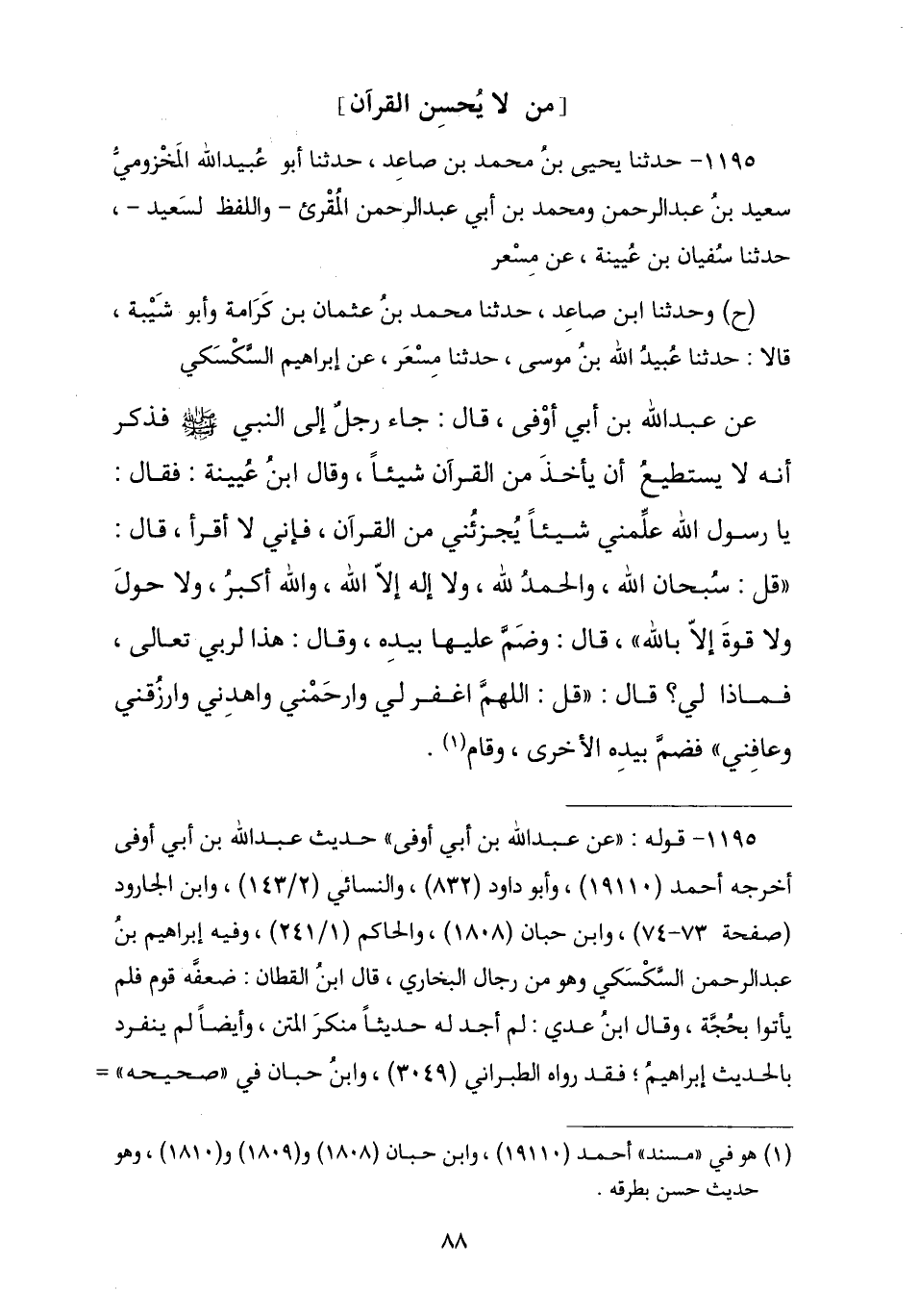 1195 - حَدَّثَنَا يَحْيَى بْنُ مُحَمَّدِ بْنِ صَاعِدٍ , ثنا أَبُو عُبَيْدِ اللَّهِ الْمَخْزُومِيُّ سَعِيدُ بْنُ عَبْدِ الرَّحْمَنِ , وَمُحَمَّدُ بْنُ أَبِي عَبْدِ الرَّحْمَنِ الْمُقْرِئُ , وَاللَّفْظُ لِسَعِيدٍ , قَالَا: ثنا سُفْيَانُ بْنُ عُيَيْنَةَ , عَنْ مِسْعَرٍ , ح وَحَدَّثَنَا ابْنُ صَاعِدٍ , ثنا مُحَمَّدُ بْنُ عُثْمَانَ بْنِ كَرَامَةَ , وَأَبُو شَيْبَةَ قَالَا: نا عُبَيْدُ اللَّهِ بْنُ مُوسَى , ثنا مِسْعَرٌ , عَنْ إِبْرَاهِيمَ السَّكْسَكِيِّ , عَنْ عُبَيْدِ اللَّهِ بْنِ أَبِي أَوْفَى , قَالَ: جَاءَ رَجُلٌ إِلَى النَّبِيِّ صَلَّى اللهُ عَلَيْهِ وَسَلَّمَ فَذَكَرَ أَنَّهُ لَا يَسْتَطِيعُ أَنْ يَأْخُذَ مِنَ الْقُرْآنِ شَيْئًا - وَقَالَ ابْنُ عُيَيْنَةَ: - فَقَالَ: يَا رَسُولَ اللَّهِ عَلِّمْنِي شَيْئًا يُجْزِينِي مِنَ الْقُرْآنِ فَإِنِّي لَا أَقْرَأُ , قَالَ: " قُلْ: سُبْحَانَ اللَّهِ وَالْحَمْدُ لِلَّهِ وَلَا إِلَهَ إِلَّا اللَّهُ وَاللَّهُ أَكْبَرُ وَلَا حَوْلَ وَلَا قُوَّةَ إِلَّا بِاللَّهِ " , قَالَ: فَضَمَّ عَلَيْهَا بِيَدِهِ , وَقَالَ: §هَذَا لِرَبِّي فَمَا لِي؟ , قَالَ: " قُلِ: اللَّهُمَّ اغْفِرْ لِي وَارْحَمْنِي وَاهْدِنِي وَارْزُقْنِي وَعَافِنِي " , فَضَمَّ بِيَدِهِ الْأُخْرَى وَقَامَ