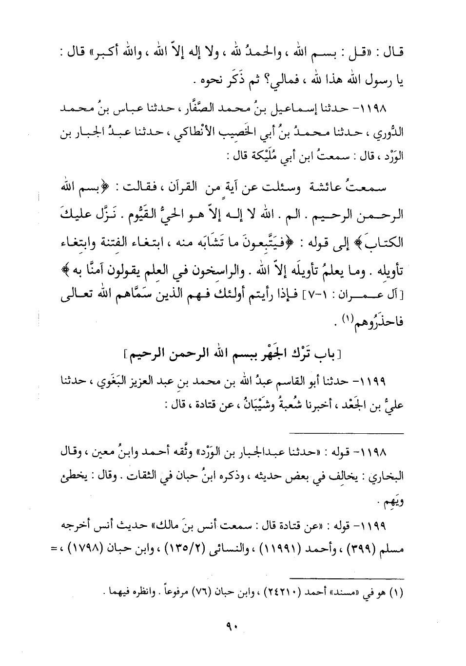 1198 - حَدَّثَنَا إِسْمَاعِيلُ بْنُ مُحَمَّدٍ الصَّفَّارُ , ثنا عَبَّاسُ بْنُ مُحَمَّدٍ الدُّورِيُّ , نا مُحَمَّدُ بْنُ أَبِي الْخَصِيبِ الْأَنْطَاكِيُّ , ثنا عَبْدُ الْجَبَّارِ بْنُ الْوَرْدِ , قَالَ: سَمِعْتُ ابْنَ أَبِي مُلَيْكَةَ , قَالَ: سَمِعْتُ عَائِشَةَ , وَسُئِلَتْ عَنْ آيَةٍ مِنَ الْقُرْآنِ , فَقَالَتْ: " بِسْمِ اللَّهِ الرَّحْمَنِ الرَّحِيمِ {الم اللَّهُ لَا إِلَهَ إِلَّا هُوَ الْحَيُّ الْقَيُّومُ نَزَّلَ عَلَيْكَ الْكِتَابَ} [آل عمران: 2] , إِلَى قَوْلِهِ {يَتَّبِعُونَ مَا تَشَابَهَ مِنْهُ} , إِلَى قَوْلِهِ {آمَنَّا بِهِ} [آل عمران: 7] , §فَإِذَا رَأَيْتُمْ أُولَئِكَ فَهُمُ الَّذِينَ سَمَّاهُمُ اللَّهُ فَاحْذَرُوهُمْ "