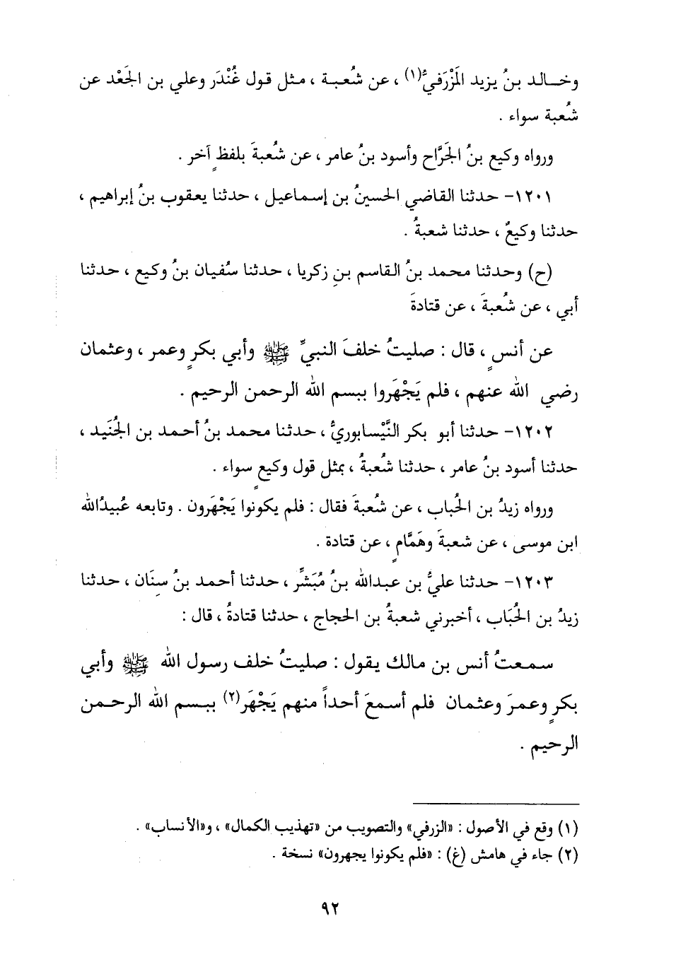 1202 - حَدَّثَنَا أَبُو بَكْرٍ النَّيْسَابُورِيُّ , ثنا مُحَمَّدُ بْنُ أَحْمَدَ بْنِ الْجُنَيْدِ , ثنا أَسْوَدُ بْنُ عَامِرٍ , ثنا شُعْبَةُ , بِمِثْلِ قَوْلِ وَكِيعٍ سَوَاءً. وَرَوَاهُ زَيْدُ بْنُ الْحُبَابِ , عَنْ شُعْبَةَ , فَقَالَ: «فَلَمْ يَكُونُوا يَجْهَرُونَ». وَتَابَعَهُ عُبَيْدُ اللَّهِ بْنُ مُوسَى , عَنْ شُعْبَةَ , وَهَمَّامٍ , عَنْ قَتَادَةَ