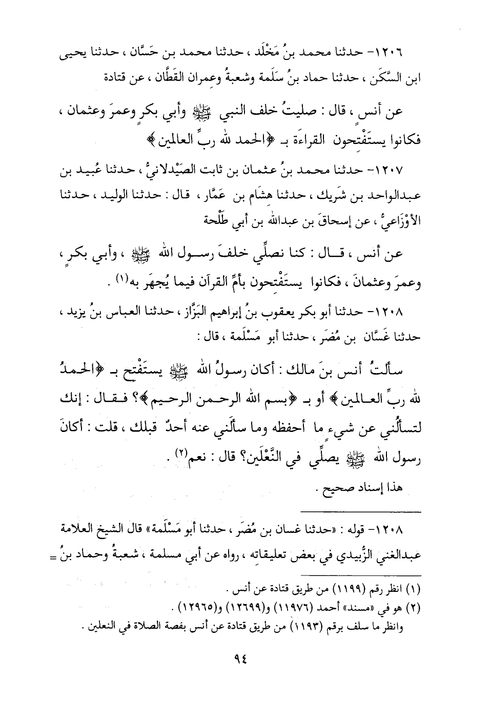 1208 - حَدَّثَنَا أَبُو بَكْرٍ يَعْقُوبُ بْنُ إِبْرَاهِيمَ الْبَزَّازُ , ثنا الْعَبَّاسُ بْنُ يَزِيدَ , ثنا غَسَّانُ بْنُ مُضَرَ , ثنا أَبُو مَسْلَمَةَ هُوَ سَعِيدُ بْنُ يَزِيدَ الْأَزْدِيُّ قَالَ: سَأَلْتُ أَنَسَ بْنَ مَالِكٍ: أَكَانَ رَسُولُ اللَّهِ صَلَّى اللهُ عَلَيْهِ وَسَلَّمَ §يَسْتَفْتِحُ بِـ {الْحَمْدِ لِلَّهِ رَبِّ الْعَالَمِينَ} [الفاتحة: 2] أَوْ بِـ {بِسْمِ اللَّهِ الرَّحْمَنِ الرَّحِيمِ} [الفاتحة: 1]؟ , فَقَالَ: «إِنَّكَ تَسْأَلُنِي عَنْ شَيْءٍ مَا أَحْفَظُهُ وَمَا سَأَلَنِي عَنْهُ أَحَدٌ قَبْلَكَ» , قُلْتُ: أَكَانَ رَسُولُ اللَّهِ صَلَّى اللهُ عَلَيْهِ وَسَلَّمَ يُصَلِّي فِي النَّعْلَيْنِ؟ , قَالَ: «نَعَمْ». هَذَا إِسْنَادٌ صَحِيحٌ