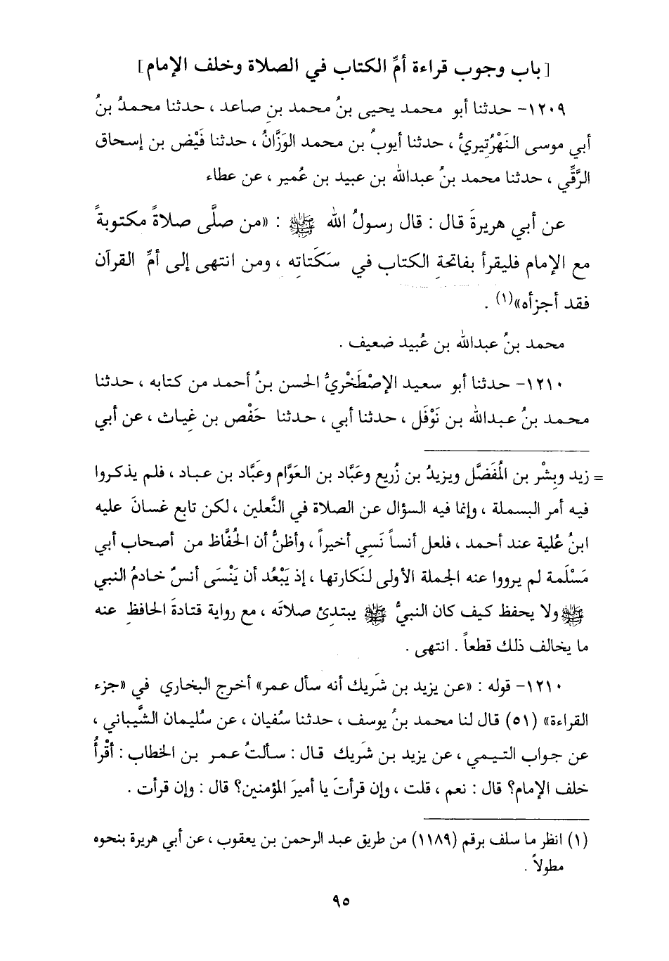1210 - حَدَّثَنَا أَبُو سَعِيدٍ الْإِصْطَخْرِيُّ الْحَسَنُ بْنُ أَحْمَدَ مِنْ كِتَابِهِ , ثنا مُحَمَّدُ بْنُ عَبْدِ اللَّهِ بْنِ نَوْفَلٍ , ثنا أَبِي , ثنا حَفْصُ بْنُ غِيَاثٍ , عَنْ أَبِي -[96]- إِسْحَاقَ الشَّيْبَانِيِّ , عَنْ جَوَّابٍ التَّيْمِيِّ , وَإِبْرَاهِيمَ بْنِ مُحَمَّدِ بْنِ الْمُنْتَشِرِ , عَنِ الْحَارِثِ بْنِ سُوَيْدٍ , عَنْ يَزِيدَ بْنِ شَرِيكٍ , أَنَّهُ سَأَلَ عُمَرَ عَنِ الْقِرَاءَةِ خَلْفَ الْإِمَامِ فَقَالَ: «§اقْرَأْ بِفَاتِحَةِ الْكِتَابِ» , قُلْتُ: وَإِنْ كُنْتَ أَنْتَ؟ , قَالَ: «وَإِنْ كُنْتُ أَنَا» , قُلْتُ: وَإِنْ جَهَرْتَ؟ , قَالَ: «وَإِنْ جَهَرْتُ». رُوَاتُهُ كُلُّهُمْ ثِقَاتٌ