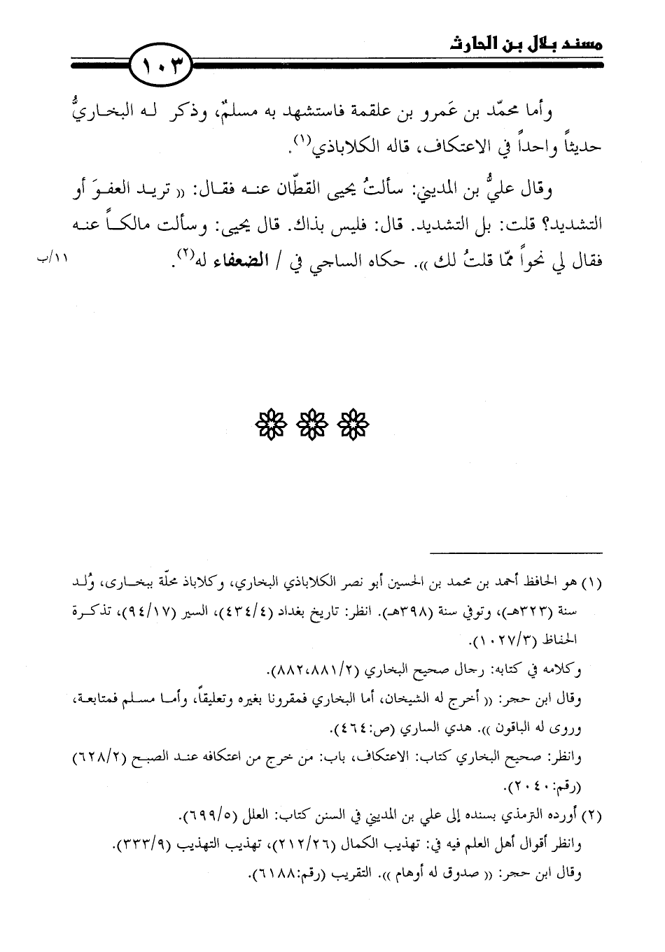 (١) هو الحافظ أحمد بن محمَّد بن الحسين أبو نصر الكلاباذي البخاري، وكلاباذ محلّة ببخارى، وُلد سنة (٣٢٣ هـ)، وتوفي سنة (٣٩٨ هـ). انظر: تاريخ بغداد (٤/ ٤٣٤)، السير (١٧/ ٩٤)، تذكرة الحفاظ (٣/ ١٠٢٧).