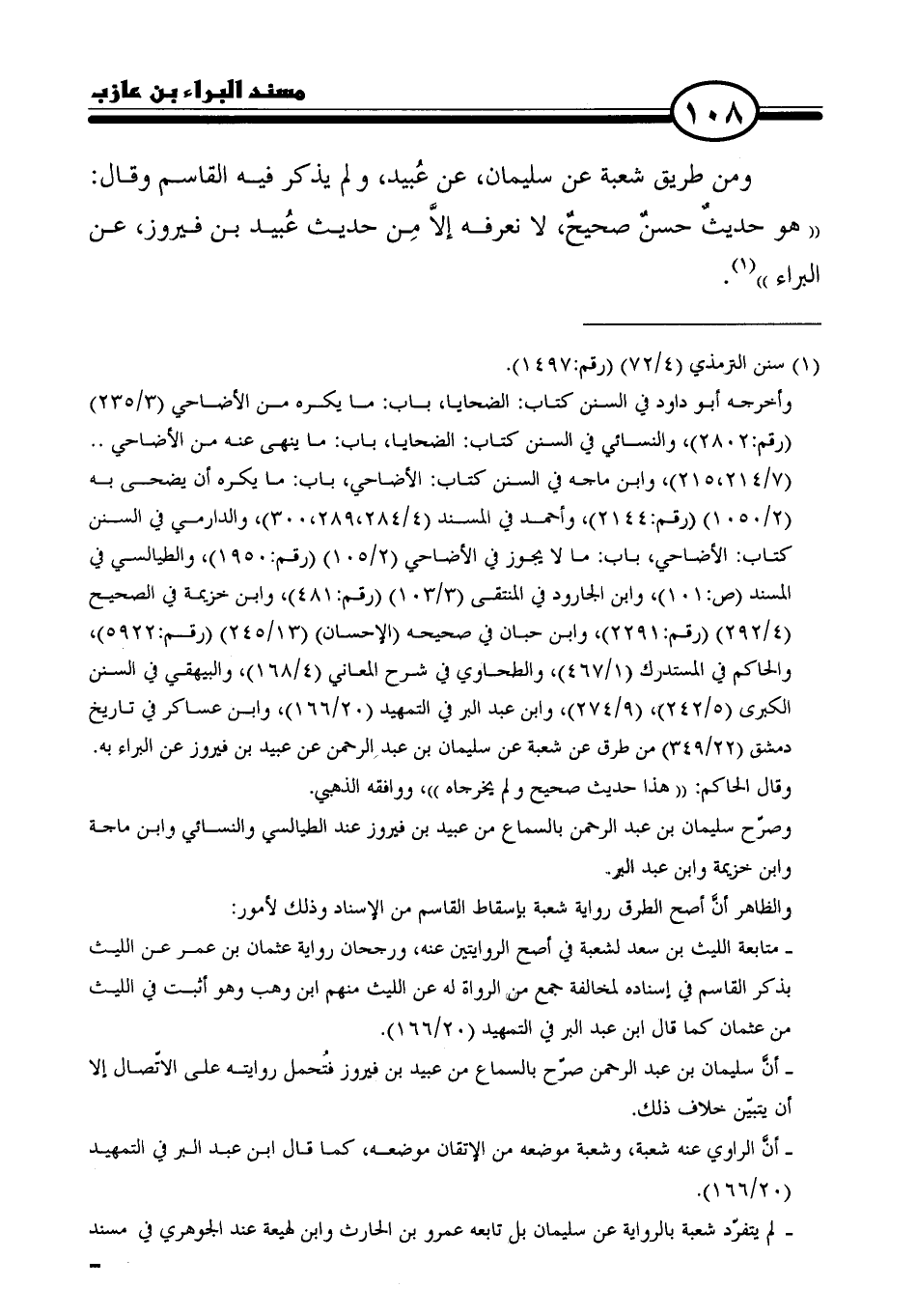 ومن طريق شعبة عن سليمان، عن عُبيد، ولم يذكر فيه القاسم وقال: "هو حديثٌ حسنٌ صحيحٌ، لا نعرفه إلَّا مِن حديث عُبيد بن فيروز، عن البراء" (١).