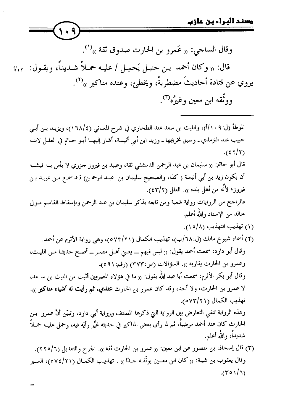 (٣) قال إسحاق بن منصور عن ابن معين: "عمرو بن الحارث ثقة". الجرح والتعديل (٦/ ٢٢٥).
