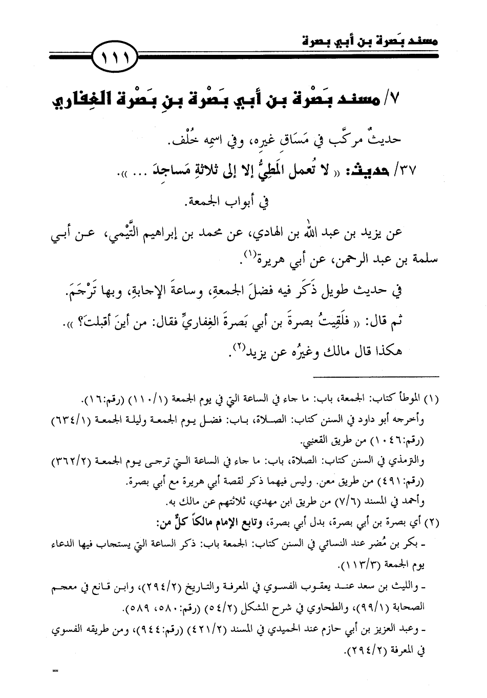 (٢) أي بصرة بن أبي بصرة، بدل أبي بصرة، وتابع الإمام مالكًا كلٌّ من: