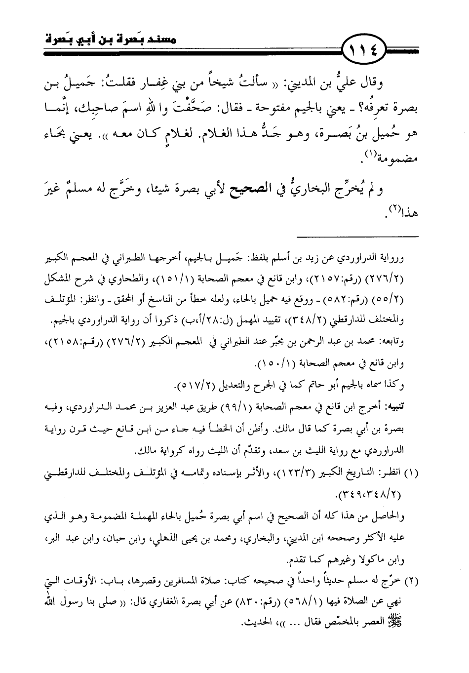 = ورواية الدراوردي عن زيد بن أسلم بلفظ: جَميل بالجيم، أخرجها الطبراني في المعجم الكبير (٢/ ٢٧٦) (رقم: ٢١٥٧)، وابن قانع في معجم الصحابة (١/ ١٥١)، والطحاوي في شرح المشكل (٢/ ٥٥) (رقم: ٥٨٢) - ووقع فيه حميل بالحاء، ولعله خطأ من الناسخ أو المحقق- وانظر: المؤتلف والمختلف للدارقطني (٢/ ٣٤٨)، تقييد المهمل (ل: ٢٨ /أ، ب) ذكروا أن رواية الدراوردي بالجيم.