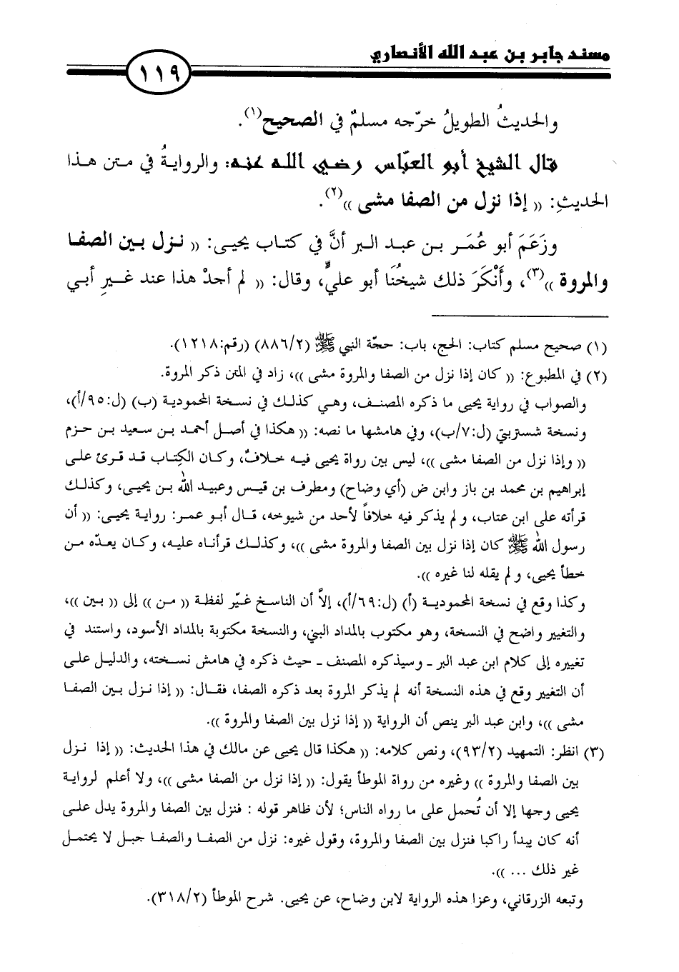 (٣) انظر: التمهيد (٢/ ٩٣)، ونص كلامه: "هكذا قال يحيى عن مالك في هذا الحديث: "إذا نزل بين الصفا والمروة" وغيره من رواة الموطأ يقول: "إذا نزل من الصفا مشى"، ولا أعلم لرواية يحيى وجها إلا أن تُحمل على ما رواه الناس؛ لأن ظاهر قوله: فنزل بين الصفا والمروة يدل على أنه كان يبدأ راكبا فنزل بين الصفا والمروة، وقول غيره: نزل من الصفا والصفا جبل لا يحتمل غير ذلك ... ".