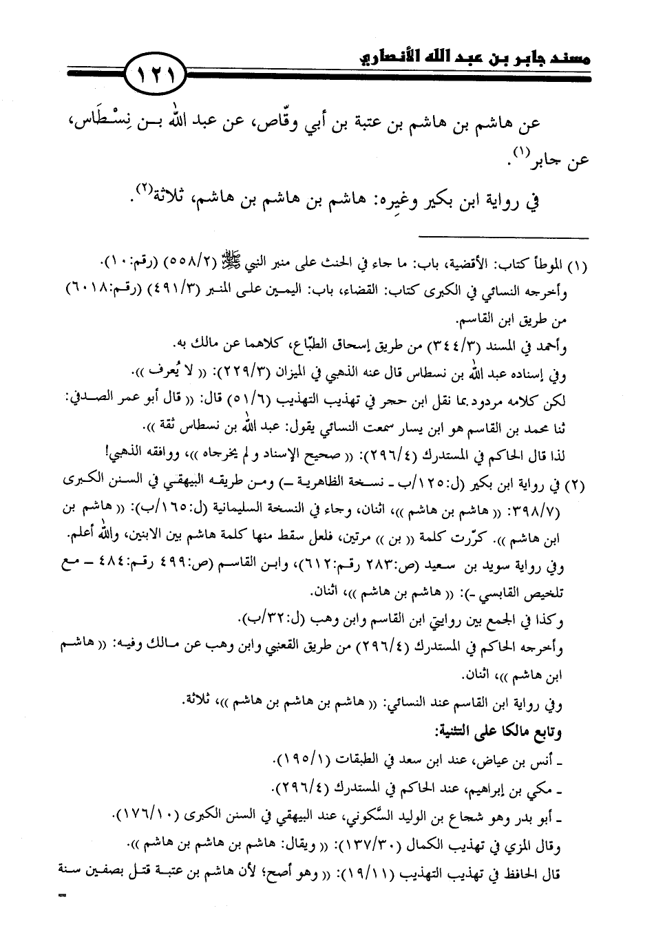(٢) في رواية ابن بكير (ل: ١٢٥/ ب- نسخة الظاهرية-) ومن طريقه البيهقي في السنن الكبرى (٧/ ٣٩٨: "هاشم بن هاشم"، اثنان، وجاء في النسخة السليمانية (ل: ١٦٥ / ب): "هاشم بن ابن هاشم". كرّرت كلمة "بن" مرتين، فلعل سقط منها كلمة هاشم بين الابنين، والله أعلم.