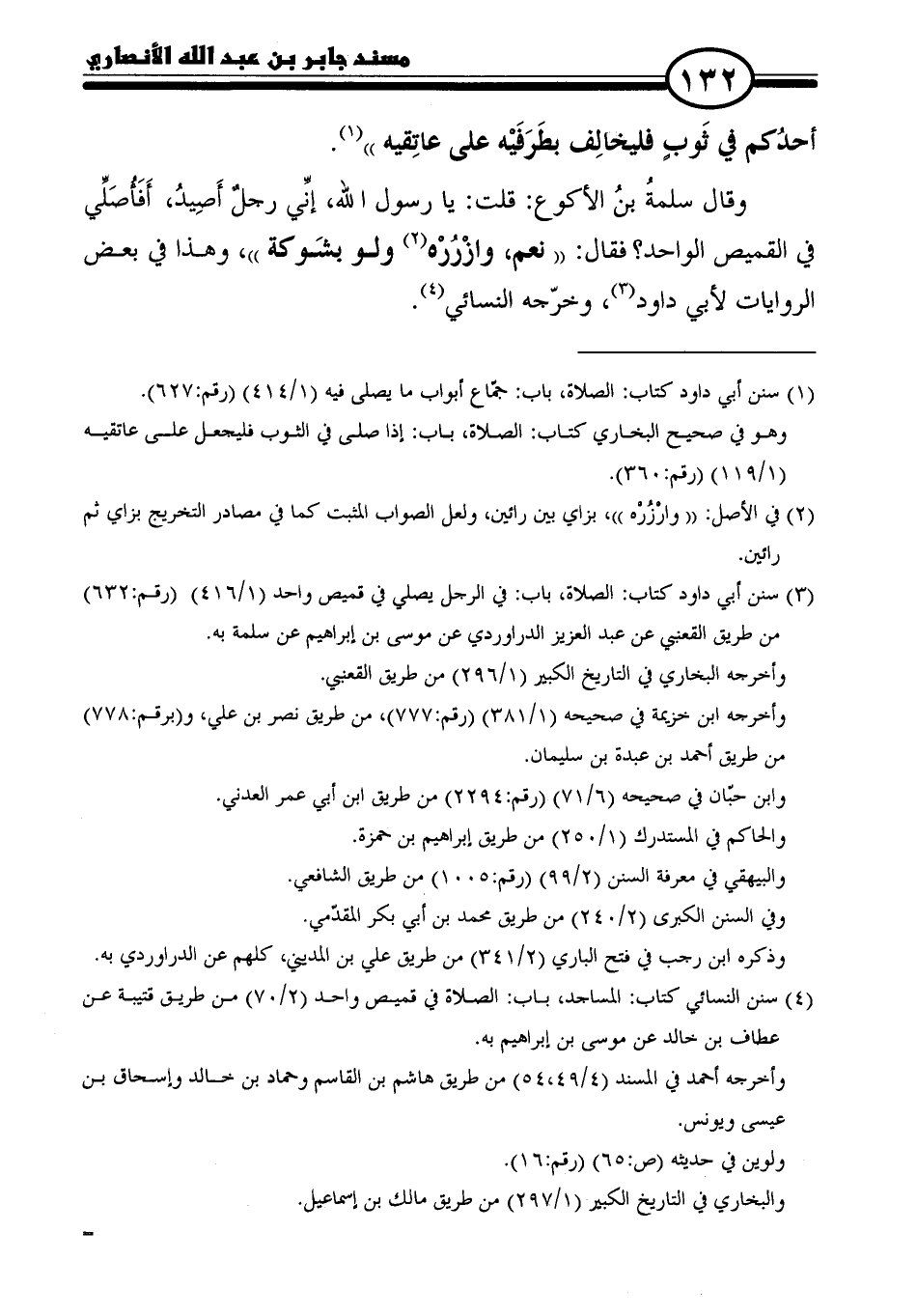 (٣) سنن أبي داود كتاب: الصلاة، باب: في الرجل يصلي في قميص واحد (١/ ٤١٦) (رقم: ٦٣٢) من طريق القعنبي عن عبد العزيز الدراوردي عن موسى بن إبراهيم عن سلمة به.