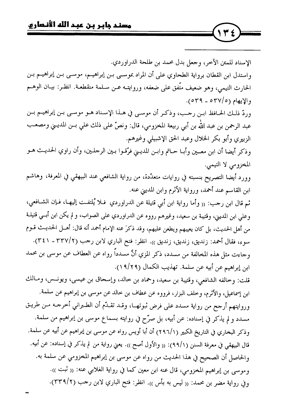 وردّ ذلك الحافظ ابن رجب، وذكر أن موسى في هذا الإسناد هو موسى بن إبراهيم بن عبد الرحمن بن عبد الله بن أبي ربيعة المخزومي، قال: ونصّ على ذلك علي بن المديني ومصعب الزبيري وأبو بكر الخلال وعبد الحق الإشبيلي وغيرهم.