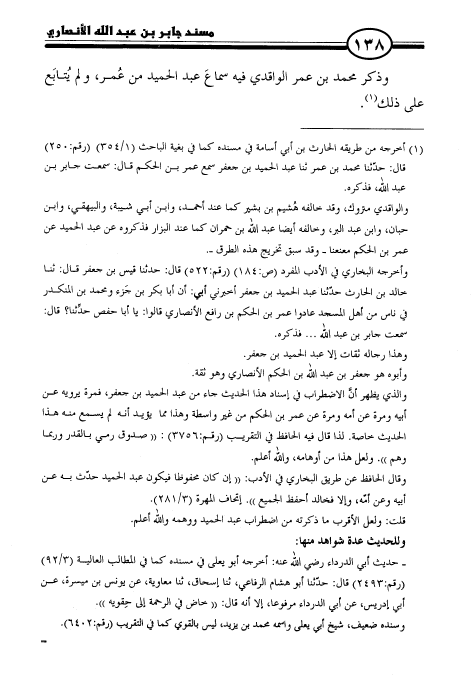 (١) أخرجه من طريقه الحارث بن أبي أسامة في مسنده كما في بغية الباحث (١/ ٣٥٤) (رقم: ٢٥٠) قال: حدثنا محمَّد بن عمر ثنا عبد الحميد بن جعفر سمع عمر بن الحكم قال: سمعت جابر بن عبد الله، فذكره.