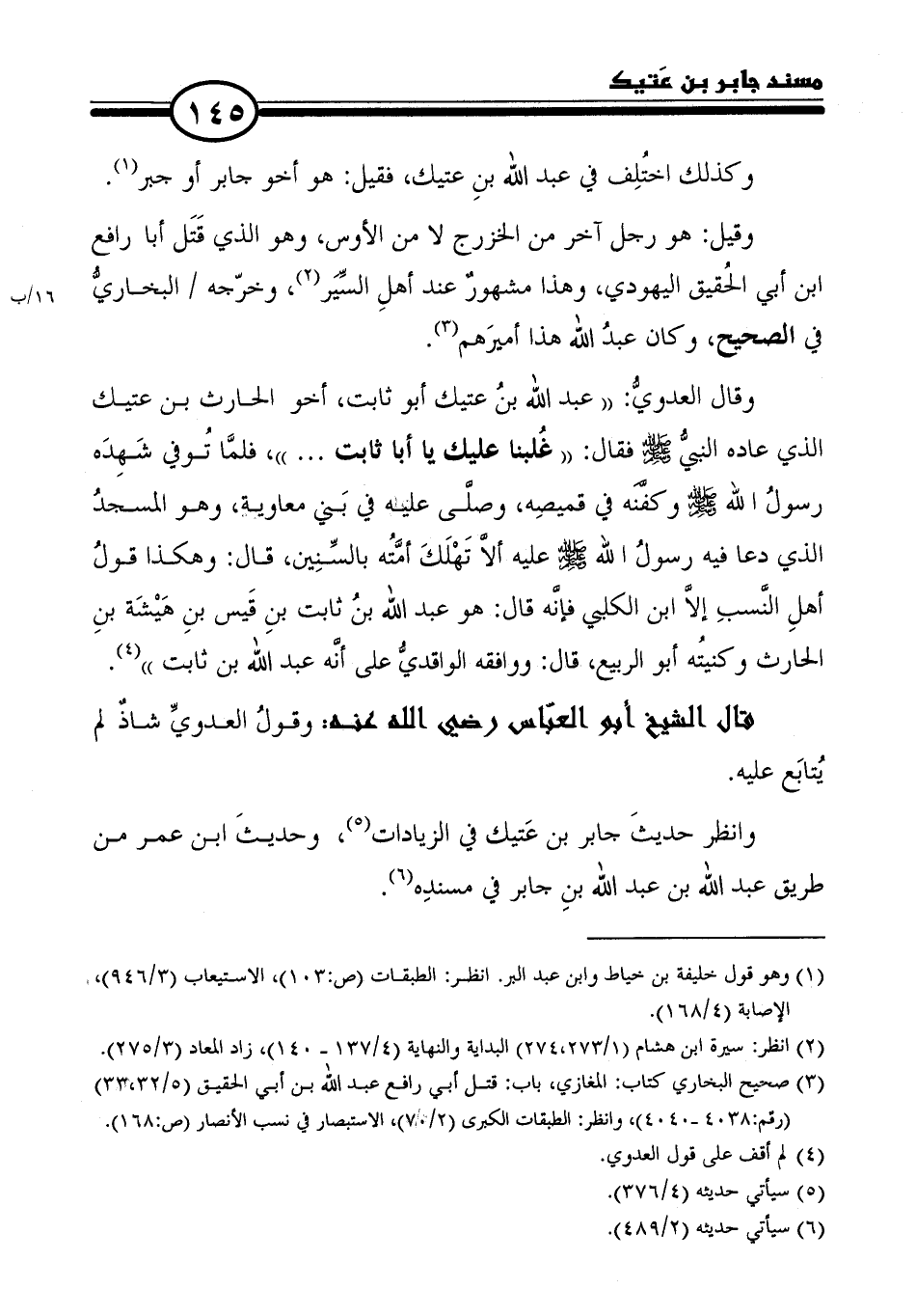 وانظر حديثَ جابر بن عَتيك في الزيادات (٥) , وحديثَ ابن عمر من طريق عبد الله بن عبد الله بنِ جابر في مسندِه (٦).
