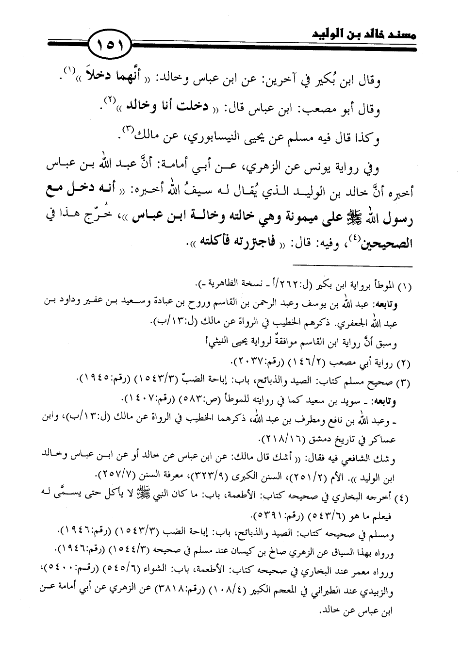 وفي رواية يونس عن الزهري، عن أبي أمامة: أنَّ عبد الله بن عباس أخبره أنَّ خالد بن الوليد الذي يُقال له سيفُ الله أخبره: "أنه دخل مع رسول الله - صلى الله عليه وسلم - على ميمونة وهي خالته وخالة ابن عباس"، خُرّج هذا في الصحيحين (٤)، وفيه: قال: "فاجتررته فأكلته".