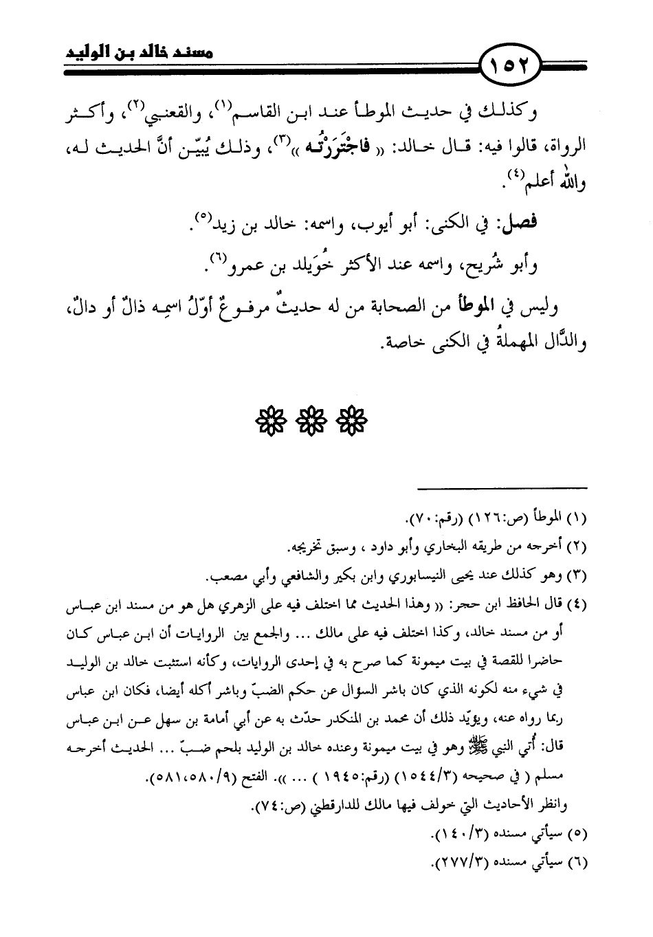 (٤) قال الحافظ ابن حجر: "وهذا الحديث مما اخثلف فيه على الزهري هل هو من مسند ابن عباس أو من مسند خالد، وكذا اختلف فيه على مالك ... والجمع بين الروايات أن ابن عباس كان حاضرًا للقصة في بيت ميمونة كما صرح به في إحدى الروايات، وكأنه استثبت خالد بن الوليد في شيء منه لكونه الذي كان باشر السؤال عن حكم الضبّ وباشر أكله أيضًا، فكان ابن عباس ربما رواه عنه، ويؤيِّد ذلك أن محمد بن المنكدر حدّث به عن أبي أمامة بن سهل عن ابن عباس قال: أُتى النبي - صلى الله عليه وسلم - وهو في بيت ميمونة وعنده خالد بن الوليد بلحم ضبّ ... الحديث أخرجه مسلم (في صحيحه (٣/ ١٥٤٤) (رقم: ١٩٤٥) .... ". الفتح (٩/ ٥٨٠، ٥٨١).
