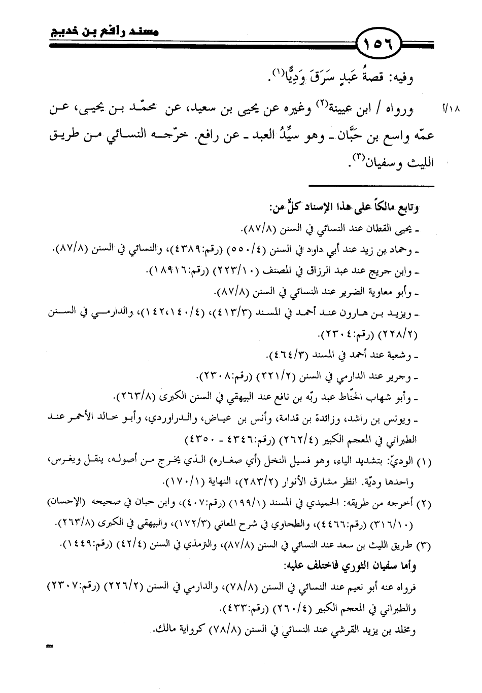 ورواه ابن عيينة (٢) وغيَره عن يحيى بن سعيد، عن محمّد بن يحيى، عن عمّه واسع بن حَبَّان - وهو سيِّدُ العبد - عن رافع. خرّجه النسائي من طريق الليث وسفيان (٣).