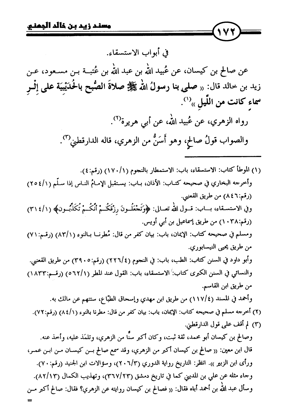 زيد بن خالد قال: "صلى بنا رسولُ الله صلاةَ الصُّبح بالحُدَيْبيَة على إِثْرِ سماءٍ كانت من اللَّيلِ" (١).