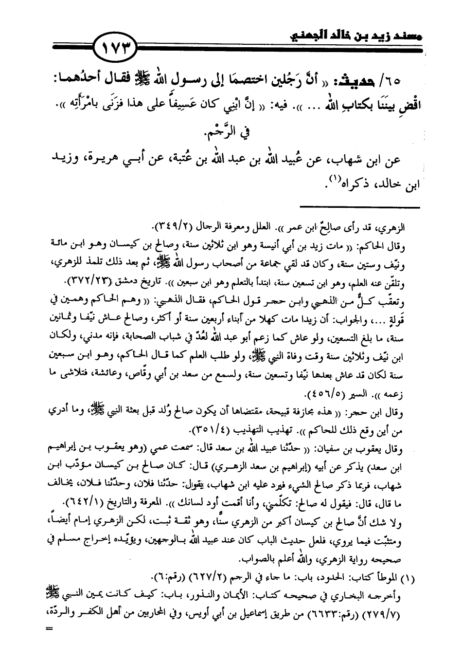 ٦٥/ حديث: "أَنَّ رَجُلين اختصمَا إلى رسولِ الله - صلى الله عليه وسلم - فقال أحدُهما: اقْضِ بينَنَا بكتابِ الله ... ". فيه: "إنَّ ابْنِي كان عَسِيفًا على هذا فزَنَى بامْرَأَتِهِ".